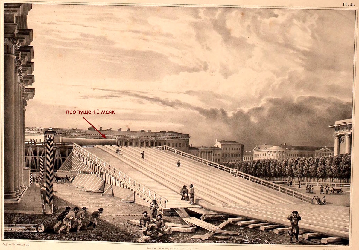 — Здесь мы видим установку гранитной колонны, предназначенной для памятника императору Александру. Распространились слухи о том, что во время её погрузки на корабль произошёл несчастный случай. Однако объяснение таково: между причалом и кораблём был зазор шириной чуть более двух аршин (1,42 м), через который нужно было построить мост. Поскольку этот мост был построен недостаточно прочно, гранитная масса обрушилась с одного конца и одновременно толкнула вниз судно, к борту которого она уже прикоснулась. Из Санкт-Петербурга немедленно были отправлены инженеры с оборудованием, чтобы снова поднять колосс. Однако даже эти чрезвычайные меры не потребовались. Рабочие быстро оправились от первоначального шока, выяснили причину, подняли колонну и успешно закатили её на корабль, так что помощь, прибывшая позже, больше не потребовалась*. Вся Дворцовая площадь в нашем городе теперь украшена внушительным памятником. Возведены строительные леса для возведения колонны, возвышающиеся выше дворца, и от них, между дворцом и Адмиралтейством, к набережной идёт наклонная эстакада.