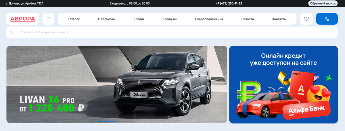 Аврора в Донецке — это автосалон в Донецке. Занимается продажей новых и подержанных автомобилей. Напрямую связан с дилерами из нашего черного списка. Больше интересного — в нашем обзоре. В автосалоне на Артема 132А в Донецке можно купить новый или подержанный автомобиль. В онлайн-каталоге более 20 марок. Сразу в глаза бросаются цены, которые ниже рынка в 2 раза. Это, а так же то, что называние салона и шаблон, на котором сделан его сайт, в точности совпадают с названием и шаблоном сети дилерских центров из нашего черного списка, стало причиной для нашего расследования. Владельцем автоцентра Название салона является ООО "АВРОРА" (ИНН 6165235622). Компания была зарегистрирована в 2023 году в Ростове-на-Дону. По юридическому адресу числится еще 7 организаций. Среднесписочная численность сотрудников — 1 человек. Фирма указана в числе владельцев АЦ АВТОПРЕМИУМ, АЦ МАКСИМУМ, АМЕГА ТРЕЙД, АМК АВТО, АВАНГАРД (АВРОРА), Аврора на Антонова Овсеенко, AG KRASNODAR, АЛЬТА ТРЕЙД, Аврора на Откосно