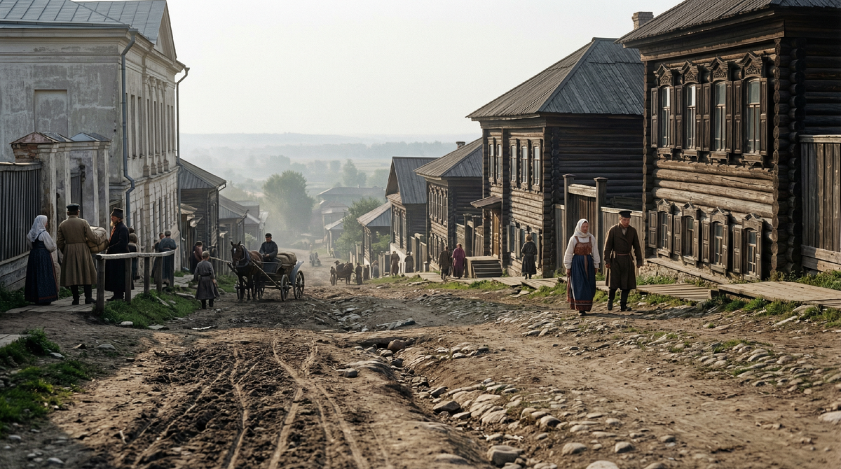 В Мценске XIX века город ощущается не через ровные линии и не через спокойствие, а через наклон, который чувствуется почти в каждом движении. Здесь пространство не лежит спокойно, оно слегка смещено, как будто тянется вниз, к реке, создавая особое ощущение глубины. Улицы, дома, даже воздух — всё подчинено этому едва заметному, но постоянному движению. И чем дольше находишься здесь, тем яснее становится: этот город не стоит на месте, он медленно перетекает. Улицы Мценска не идут прямо, они чаще спускаются или поднимаются, создавая ощущение движения даже тогда, когда стоишь на месте. Грунтовые дороги неровные, с мягкими перепадами, которые не бросаются в глаза, но чувствуется ногами. Дома стоят вдоль этих линий, повторяя их, не сопротивляясь рельефу. Идёшь по такой улице — и понимаешь, что она не ведёт вперёд, а постепенно опускает вглубь города. Застройка Мценска выглядит устойчивой, но в ней есть ощущение приспособленности к местности. Деревянные дома стоят немного неровно, иногда выш