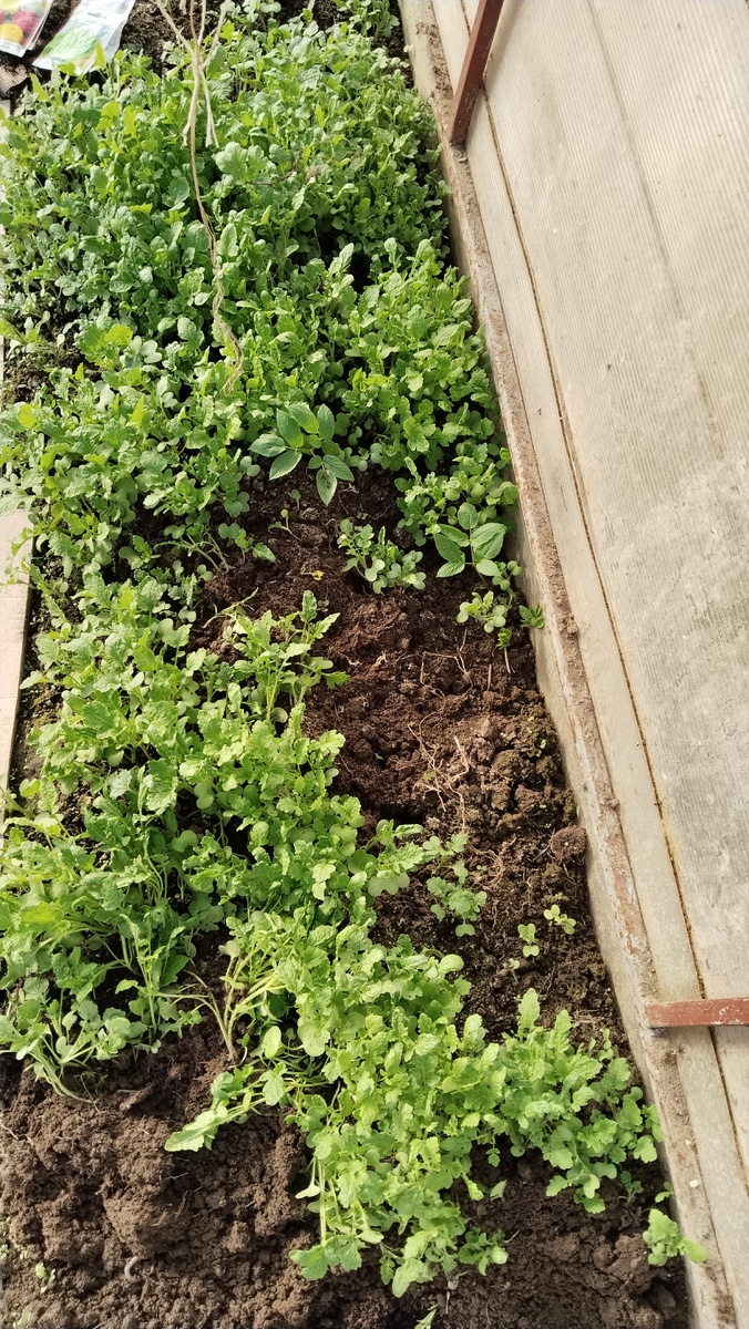В теплице уже бодро поднялась горчица. Как адепт биологического земледелия, я не стала её вырывать. Просто заделала зеленую массу в почву на полштыка лопаты. Зачем?