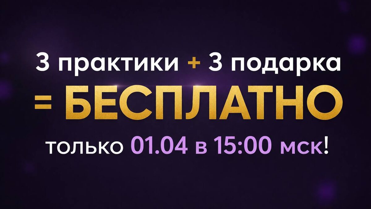 ! 3 практики. 3 подарка. Бесплатно только сегодня! Завтра подарков уже не будет, а практики будут стоить 3990 руб. ➡️ Бесплатная регистрация здесь ⬅️ Весеннее пробуждение начинается СЕГОДНЯ 01.04 15:00 мск