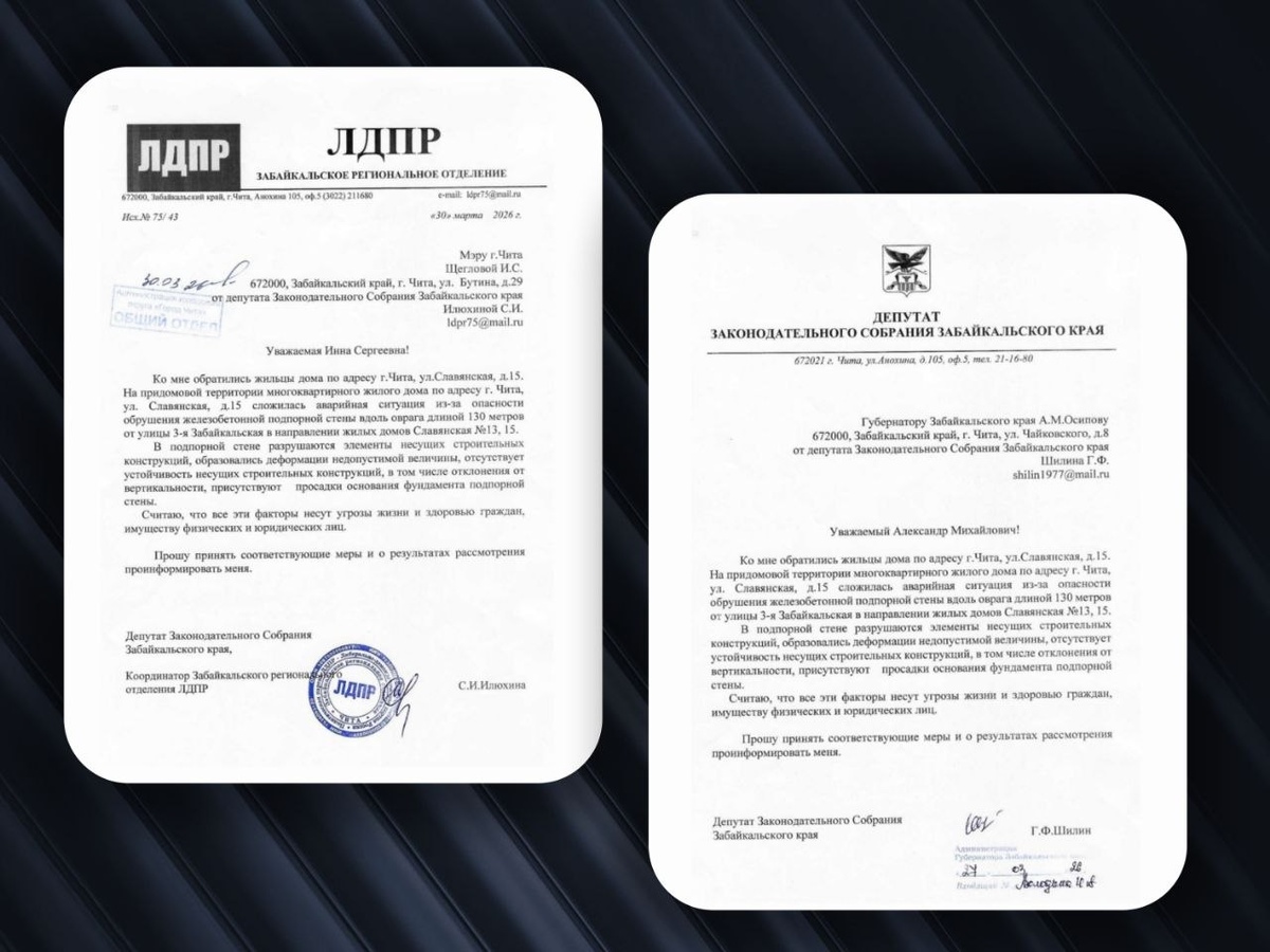 К нам в ЛДПР обратились жильцы многоквартирного дома по адресу: г. Чита, ул. Славянская, д.15. Ситуация — критическая. На придомовой территории прямо вдоль оврага находится железобетонная подпорная стена длиной 130 метров (от ул. 3-я Забайкальская в сторону домов №13 и №15). Мы уже рассказывали об этой проблеме 👉 https://dzen.ru/media/zabaykalskiy_ldpr/k-nam-obratilis-jilcy-mnogokvartirnogo-doma-raspolojennogo-po-adresu-g-69c5ef8fd6634411bc69c1d7 Это прямая угроза жизни, здоровью и имуществу людей! Стена может обрушиться в любой момент. ✅ Наша команда начала работу над этим обращением. Направили официальные запросы губернатору Забайкальского края Александру Михайловичу Осипову и мэру города Читы Инне Сергеевне Щегловой с требованием принять неотложные меры. ❗ ЛДПР продолжает мониторинг ситуации по обращениям жителей. Держим вопрос на контроле. Просим профильные ведомства не отписываться, а действовать. Жизнь людей важнее бумаг!