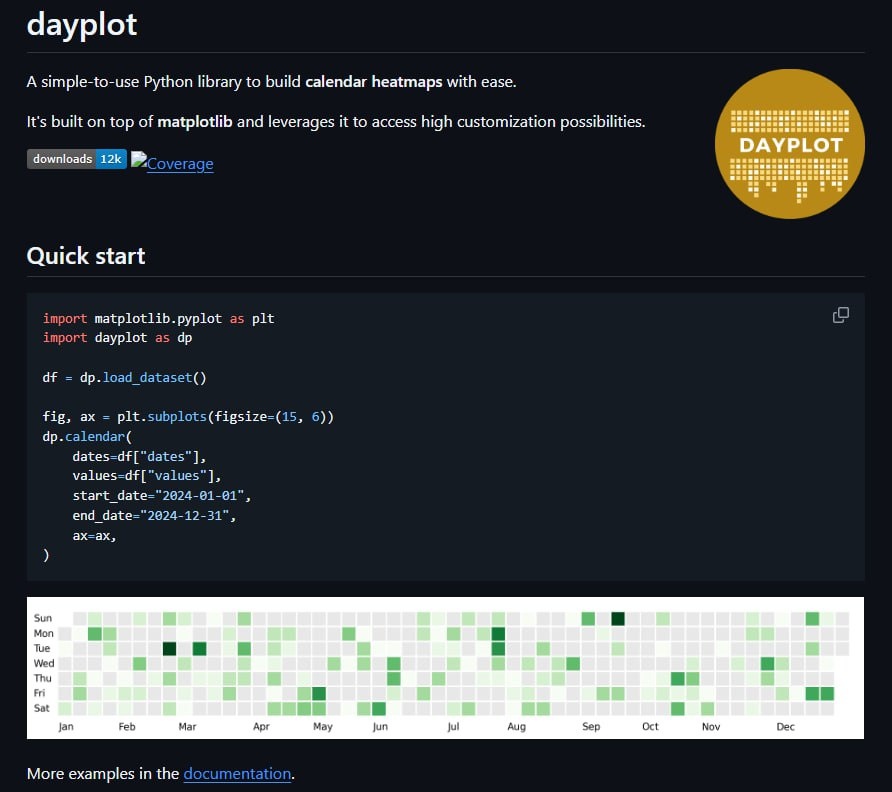 в GitHub. Помогает быстро анализировать распределение событий по дням. 📌 Основные особенности: 🔵Построение календарных heatmap-графиков 🔵Работа с временными рядами pandashttps://skr.sh/saNu7Q7czX6 🔵Настройка цветов и отображения 🔵Удобная визуализация активности по датам ➡️Установка библиотеки: pip install dayplot 📱 Репозиторий ⚙️ Документация ➡️Справочник Программиста. Подписаться