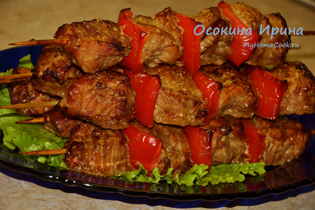 В миске смешала 3 ст.л. соуса "Терияки сладкий" с 2 ст.л. устричного соуса, 2 ст.л. соевого соуса и промешала, добавила 1 кг филе грудки индейки средне-крупными кусочками, промешала хорошенько, добавила 2 ст.л. кунжута, снова промешала и убрала в прохладу на ночь мариноваться. Сегодня нанизала индейку на заранее замоченные в воде деревянные шпажки, перемешала ломтиками красного сладкого перца, уложила в устланную пекарской бумагой форму, сбрызнула оливковым маслом и запекла в духовке, разогретой до 180 градусов, в течение 25 минут. Вкуснятина, сочнятина и просто гастрономический восторг) Приятного аппетита