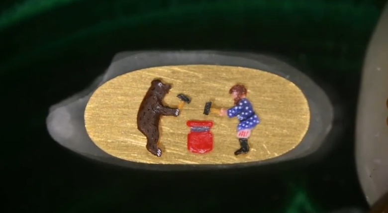 Новосибирский микроминиатюрист Владимир Анискин, живущий и работающий в Академгородке, поделился радостной новостью. Ему удалось завершить работу над первой движущейся микроминиатюрой — на рисовом зёрнышке поселились «Мужик и Медведь». Вдохновением для мастера послужила русская деревянная игрушка с таким же названием. Первые попытки воплотить задумку он предпринял несколько лет назад, но столкнулся с трудностями и отложил работу. «Думал, пробовал, думал, пробовал, наконец додумался и получилось. Слава Богу!» — рассказал Владимир Анискин на своей странице ВКонтакте. Самое сложное было в том, чтобы несколько деталей с отверстиями и штырьками сделать отдельно и при сборке совместить их друг с другом с точностью до человеческого волоса. Без такой точности движение заклинивало бы. В миниатюре реализовано простое возвратно-поступательное движение, но воплотить его в таком масштабе оказалось делом крайне кропотливым. «Только не спрашивайте, как (почему, за счет чего) фигурки двигаются! Ни