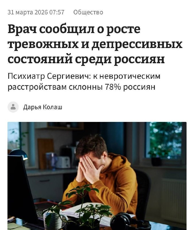 Врач-психиатр Александр Сергиевич бьёт тревогу: по его словам, 78% россиян оказались в цепких лапах депрессии и тревожности. Страна переживает настоящую эпидемию душевного нездоровья. Причина — в постоянном давлении: хронический стресс, конфликты и рабочие перегрузки стали нормой жизни. Это приводит к эмоциональным качелям, выгоранию и паническим атакам, которые уже не редкость. Впрочем, неудивительно… 📲 Читайте нас в MAX 😊 Подписаться | Прислать новость