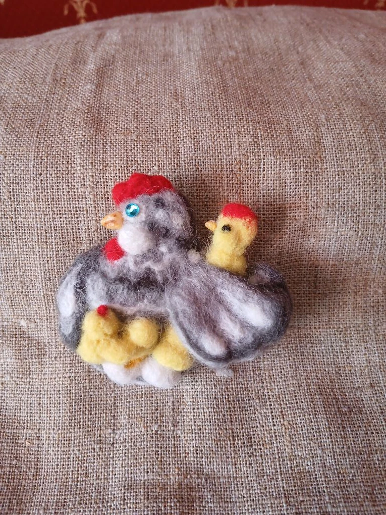Сегодня я расскажу вам, нет, не сказку, хотя название статьи очень на это намекает. Почти все русские народные сказки именно так и начинаются. Так же, как одна из первых нами услышанных сказок:" Жили- были дед да баба и была у них курочка Ряба..." Я сегодня расскажу вам о своих любимых курочках. На тему для сегодняшней странички меня сподвигло ожидание Пасхи. Не секрет, что мы начинаем заранее готовиться к этому светлому празднику. Многие не только украшают яйца и пекут куличи но и придумывают декор дома. Традиционно в нём используются изображения курочек и петушков. Сейчас, рядом с этими милыми персонажами, можно увидеть и кроликов с зайчиками. Они вполне равноправно с курочками могут участвовать в праздничном декоре. Но сегодня я хочу вам показать именно моих домашних "пернатых" и это будут не праздничные украшения, а предметы нашего повседневного быта. Я когда- то давно прониклась симпатией к этой милой домашней птице и потихоньку начала собирать всё, на чём встречала её изображение. Потом уже искала именно такие вещи. Со временем это превратилось в постоянное занятие. Но я стараюсь не просто собирать что-то, а хочу, чтобы вещи служили для дела. Но сначала я познакомлю вас с последним моим собственноручным изделием. Буквально вчера я закончила делать брошь из шерсти.