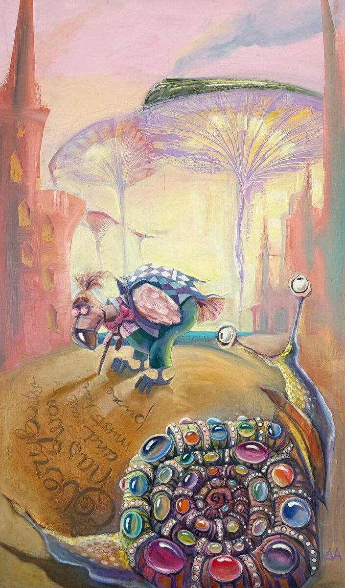 100х60 холст/масло 2026 ••• Картина «Правильность формы несущественна» иллюстрирует третью главу «Алисы в стране Чудес» - «Бег по кругу или длинный рассказ». В центре композиции — птица Додо, ключевой персонаж этой главы. Именно Додо предлагает абсурдное решение — бегать по кругу, чтобы высохнуть, а затем устраивает «бесконечный рассказ». Вокруг сказочный пейзаж с вытянутыми башнями и гигантскими растениями- грибами, по шляпкам которых несётся скорый поезд. Пастельная гамма, мягкие переходы, воздушная перспектива создают ощущение визуальной хрупкости. При этом детали, особенно в нижней части композиции, придают изображению плотность и материальность, уравновешивая его сказочную ирреальность. В этом мире все предметы и персонажи существуют по законам сна, воспоминаний и метафоры. В картине отчетливо проявляется связь с традицией абсурда, гротеска и символистской образности. У Екатерины Ващинской это можно прочитать, как продолжение кэрролловского метода: художница через Додо иронизиру