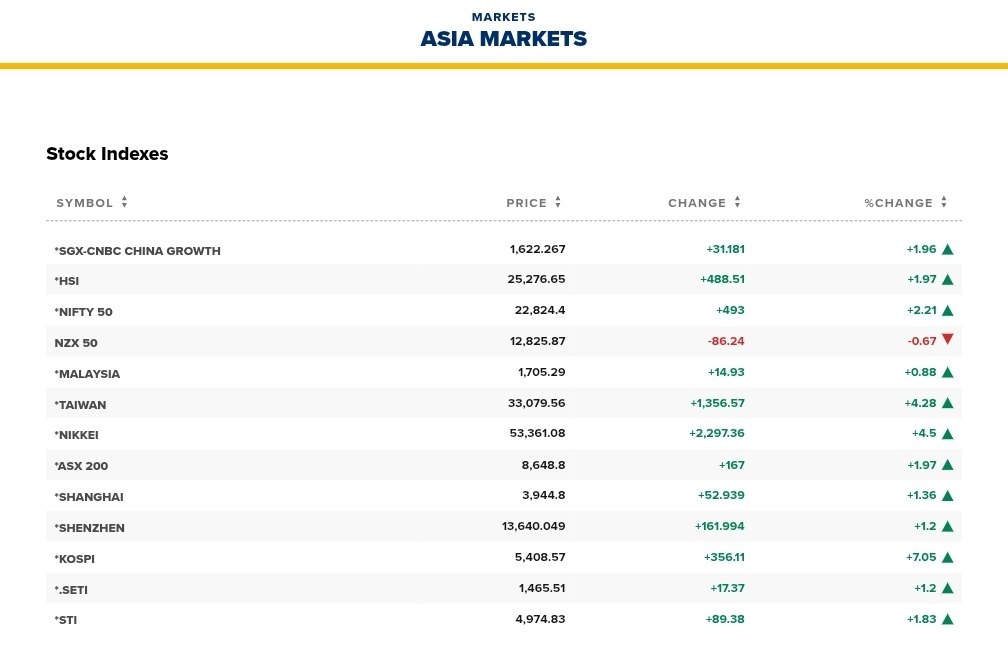 Японский Nikkei вырос на 4,5%, увеличив рыночную капитализацию примерно на $290 млрд. Южнокорейский KOSPI поднялся на 7,05%, прибавив около $210 млрд.