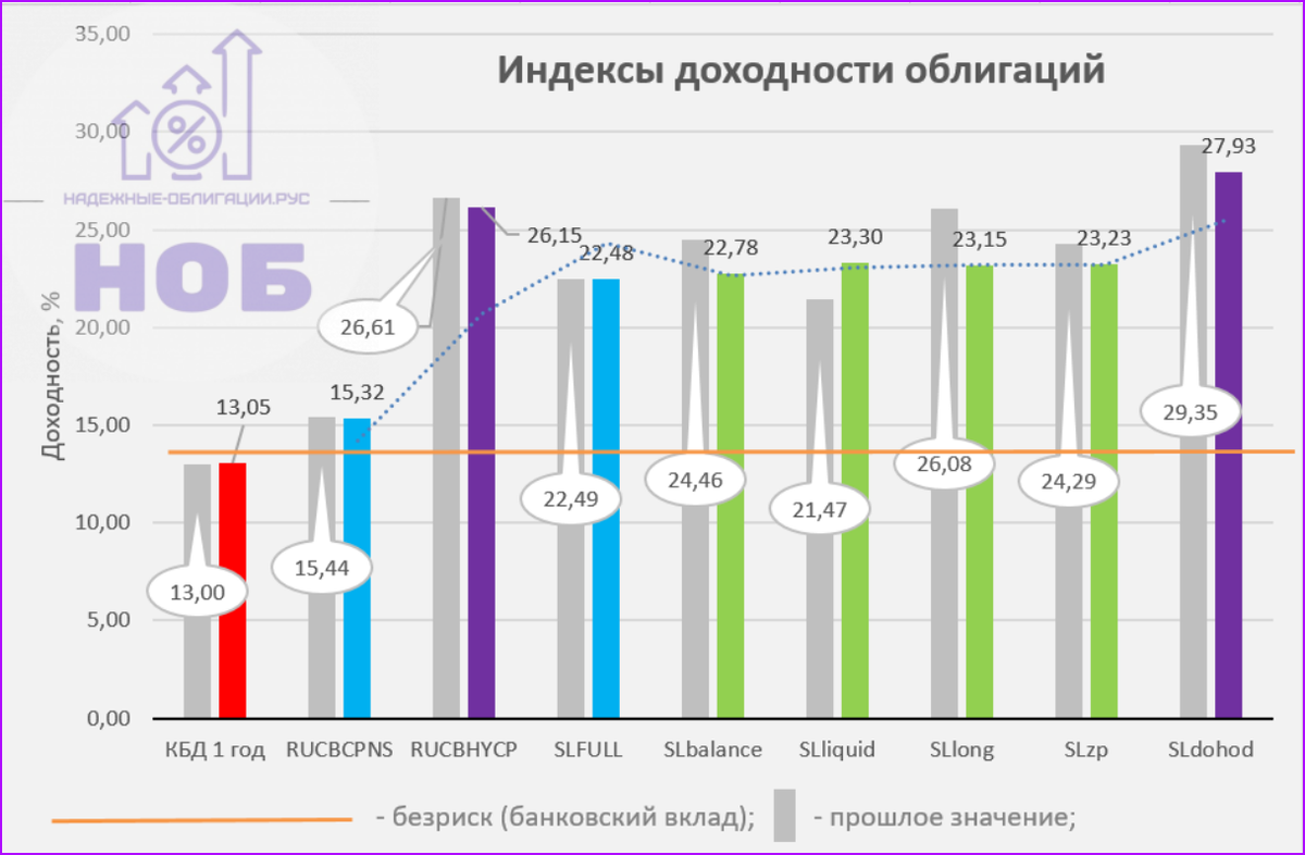 ✅ Максимальная процентная ставка по вкладам, публикуемая Банком России, 13,8, регулятор не обновлял данные; ✅ Индекс ОФЗ (КБД публикуется на сайте Мосбиржи) с дюрацией 1 год (КБД 1 год на графике👆) - впервые за длительный период хоть мизерный, но рост доходности; ✅ Индекс корпоративных облигаций RUCBCPNS (публикуется на сайте Мосбиржи) - почти нет изменений; ✅ Индекс высокодоходных облигаций RUCBHYCP (публикуется на сайте Мосбиржи) - тенденция к осторожному снижению; 📌 Индекс полной доходности Списка Лучших облигаций 2026 SLFULL без изменений. В Список вошло 70 облигации вместо 65 ранее, общий порог входа по YTM/CY не менялся. ✅ Индекс SLbalance портфеля СБАЛАНСИРОВАННЫЙ - снижение более 1%; ✅ Доходность ликвидной части Списка SLliquid - рост более 1%; ✅ Индекс портфеля ДОЛГОСРОЧНЫЙ SLlong - снижение почти 3%; ✅ Индекс облигаций с ежемесячным купоном SLzp - снижение на 1%; ✅ Портфель ДОХОДНЫЙ (индекс SLdohod) - снижение более 1%. Как формируются индексы (ссылка активна). Состав портф