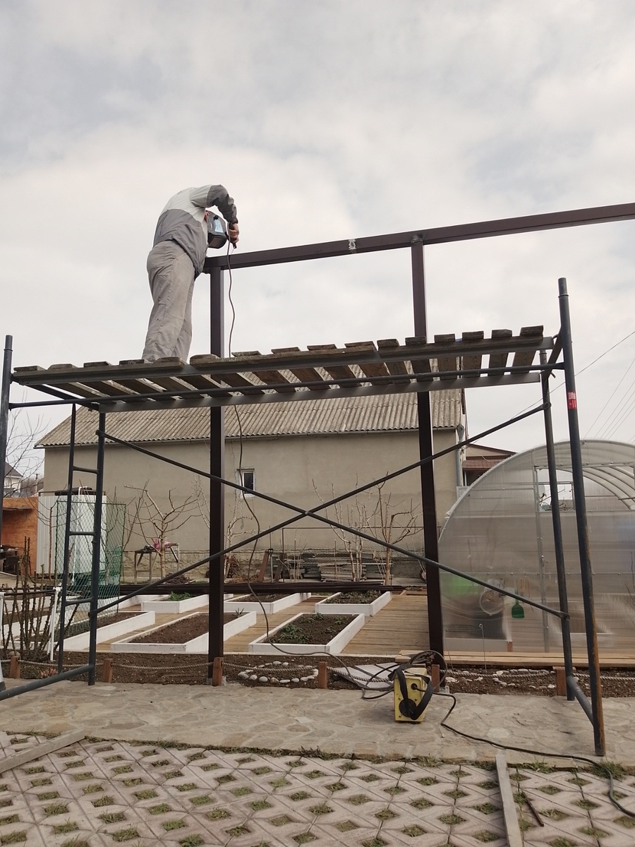 Здравствуйте! Что то год начался с навесов. Причем не только автомобильных. Если считать навес рядом с хозблоком на доме из газоблока, это будет уже шестой навес за не большое время. А начиналось все в Крыму со штукатурки, потом пошли заборы, потом каркасники, потом несколько крыш, сейчас вот один за одним навесы. Сначала крылечки в Крымском селе, потом автомобильный навес в Крымской глубинке, навес себе в Парусе, теперь навес здесь. Ранее мы здесь ворота откатные делали, теперь пришла очередь навеса. Здесь будет арочный навес. У нас нет возможности, точнее места где сварить арочные балки, обращался к местным ребятам, то же то некогда, то неохота, то дорого, в общем заказчик сам этот вопрос решил. Своими силами с помощником сварили балки. Наша задача была сварить конструкцию воедино, и накрыть покрытием. Вот такие вот арочные балки, из двадцатой трубы, нижняя, скажем так стропило, ровное, верхняя гнутая аркой, ну и укрепляющие раскосины. Приехали, начали с бурения отверстий под