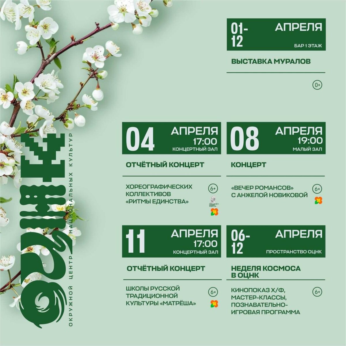 📆 Не знаете, чем заняться в апреле? Окружной Центр национальных культур собрал все самое интересное в одном списке. Сохраняйте наш дайджест, чтобы ничего не пропустить! 👇 🔸 выставка муралов, вход свободный; 🔸 концерт «Ритмы единства»: clck.ru/3SbXPQ; 🔸 концерт «Вечер романсов» с Анжелой Новиковой, забронировать место: clck.ru/3SVYbS; 🔸 отчетный концерт школы русской традиционной культуры «Матрёша», забронировать место: clck.ru/3SUYU4; 🔸 неделя космоса, вход свободный; 🔸 квартирник «Эн пов» (Не бойся) коми-фольклорной группы «Обдорянка»: clck.ru/3SrSkY; 🔸 юбилейный концерт «Сила притяжения» ансамбля северного танца «Яберена Нумги»: clck.ru/3Sbb7Q; 🔸 молодежная акция «Культурный квартал»: clck.ru/3SwT83 🔸 отчетный концерт «Личный дневник» Центра эстрадного творчества: clck.ru/3Ss8Fu; 🔸 юбилейный концерт «Это мечта» Центра эстрадного творчества: clck.ru/3Ss8Kh; 🔸 комплекс мастер-классов «Без границ», подать заявку по ссылке: clck.ru/3Riqan. 📌билеты можно приобрести по Пуш