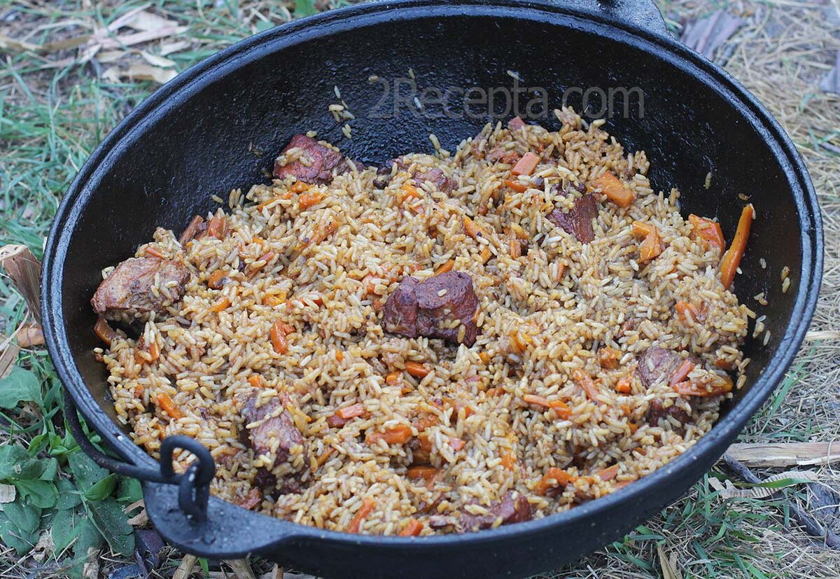 Разогреваем казан на максимальном огне до появления легкого белого дымка над маслом, после чего аккуратно опускаем в него лук и обжариваем его до темно-золотистого цвета, что крайне важно, так как именно карамелизированный лук в дальнейшем отдаст свой цвет рису, делая его аппетитно смуглым.