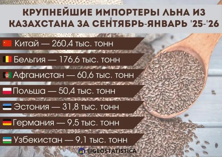 В Telegram-канале "Геостатистика" опубликованы данные о существенном росте экспорта льна из Казахстана в текущем маркетинговом году. Согласно приведенной информации, за сентябрь-январь 2025/26 маркетингового года объем поставок казахстанского льна за рубеж увеличился в 2,4 раза по сравнению с аналогичным периодом предыдущего маркетингового года. Одновременно этот показатель на 21 процент превысил весь объем экспорта, зафиксированный за полный прошлый маркетинговый год.