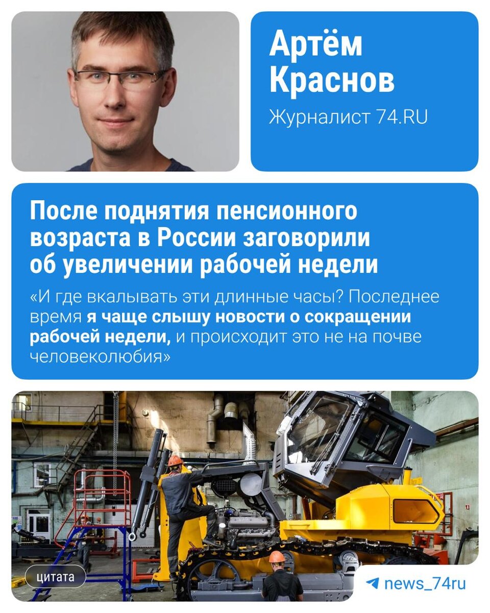 Обсуждаем идею 12-часового рабочего дня Высказывание олигарха Дерипаски о переходе с 40-часовой на 72-часовую рабочую неделю не получили явной поддержки среди официальных лиц, но многие восприняли его тезисы как «прогрев» населения перед реальным обсуждением (повысили же пенсионный возраст). Журналист @74.ru Артем Краснов считает идею бессмысленной. Приводим его мнение от первого лица ⬇️ Вообще-то есть люди, готовые работать по 12 и даже 16 часов в сутки, но с их трудоголизмом само же государство и боролось. Например, таксисты и водители-дальнобойщики, чей «гонорар» сильно зависит от выработки, нередко готовы к почти круглосуточной работе, но обратная сторона этого подхода изучена в мельчайших деталях. Обычно это детали от разметанного по обочине КамАЗа или «Синотрака». Ущерб от утомленного шестидневкой офисного работника обычно не так эффектен, другой вопрос, есть ли толк от таких трудовых «подвигов»? Потому что высиживать 72 часа в неделю и быть эффективным все это время — разные