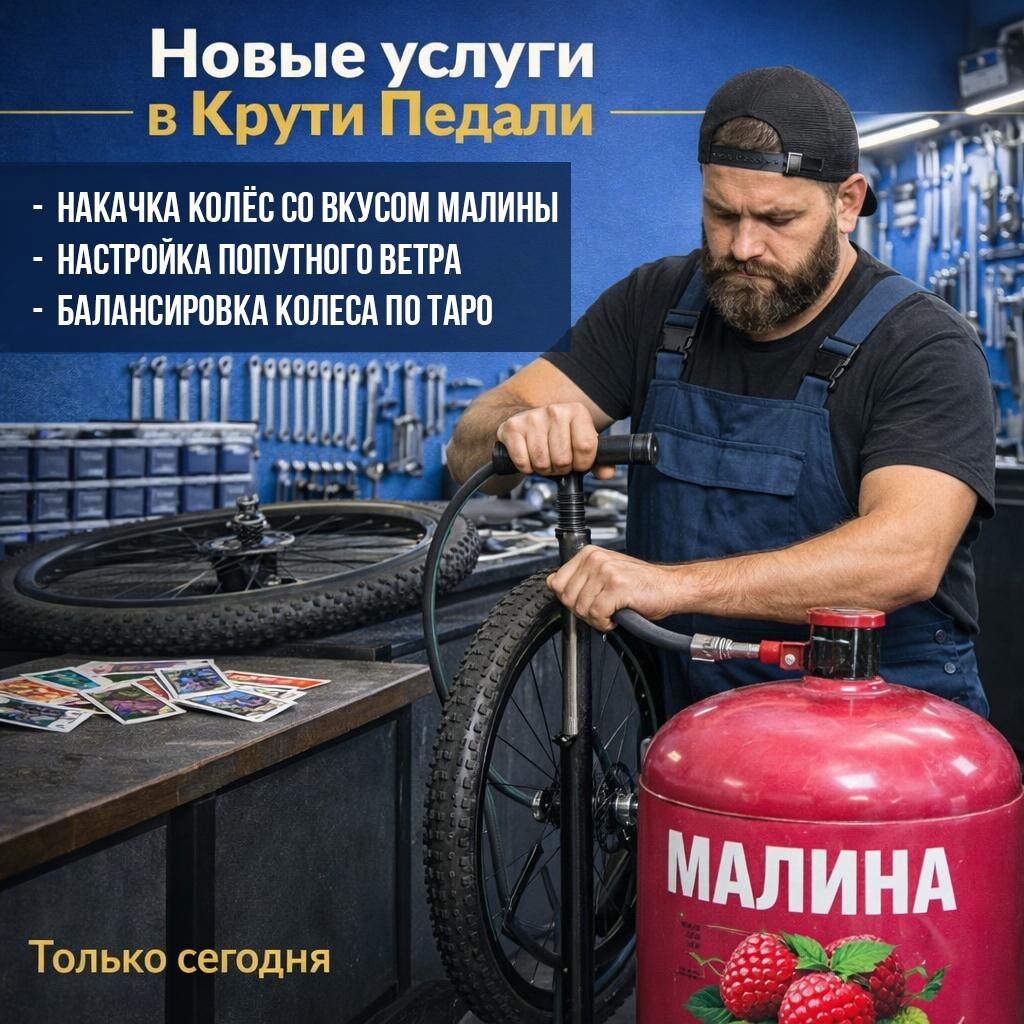 🚲 Теперь у нас доступны: - Накачка колёс воздухом со вкусом малины - 30 руб - Настройка скорости попутного ветра - 190 руб - Балансировка колёс по картам таро - 390 руб Услуги уже можно протестировать в мастерской Также сегодня действует акция: 🎤 Расскажите шутку мастеру и получите скидку на ремонт — нормальная смешная шутка - 5% — если мастер не сможет сдержать смех - 20% Скидка распространяется только на ремонт 📍 Казань, Университетская 34 🕘 Работаем с 10:00 до 20:00 📲 @krutipedals 📞 89172254879