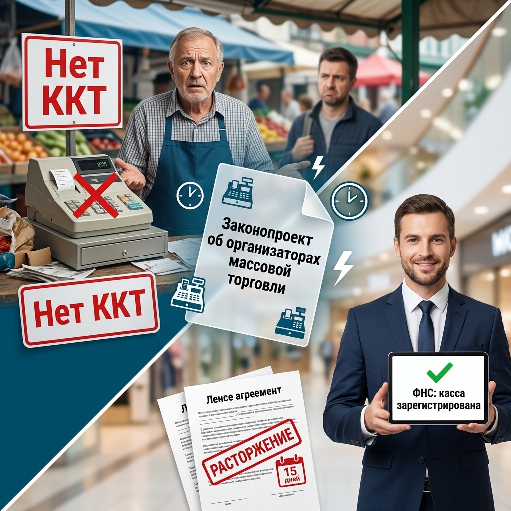 Правительство внесло в Госдуму законопроект, который меняет правила игры для всех, кто сдаёт или арендует площади на рынках и в торговых центрах. Теперь управляющие компаниям придётся следить за кассами арендаторов — и расторгать договоры с теми, кто работает без ККТ. Уже несколько лет налоговики борются с теми, кто работает «в чёрную». Особенно остро проблема стояла на рынках: часть арендаторов не пробивали чеки, а управляющие компании отмахивались, мол, «мы не рынок, а торговый центр, у нас нет обязанности проверять». Такой приём срабатывал, потому что в законе чётко не было прописано, кто именно должен контролировать арендаторов. Лазейку закрывают. Теперь вводится новое понятие — «организатор массовой торговли». Это ИП или компания, которая: Под определение попадают практически все, кто управляет недвижимостью, где торгуют несколько арендаторов. Новый законопроект (внесён 31 марта 2026 года) возлагает на них серьёзные обязанности: За невыполнение этих требований предусмотрены штрафы