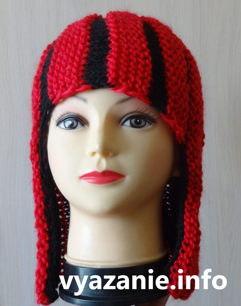 - При вязании чёрно-зелёной шапки все дорожки вязала по 6 рядов и в чёрных дорожках уже по 2 укороченных ряда, второй укороченный ряд вязала примерно до середины ряда. Я хотела, чтобы шапка не сужалась книзу. В итоге, полы шапки расходятся, а не обрамляют лицо. Тоже хорошо, но больше похоже на мужской головной убор воинов татаро-монгольской орды. Возможно, если подобрать цвета, так получится мужская шапка для бани. Эта шапка получилась короткой. Поэтому, её макушку я надвязала, пытаясь удлинить, лицевой гладью. Обвязала чёлку крючком. Один ряд столбиками без накида.