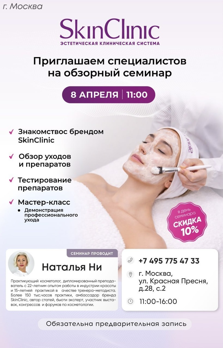 сильные возможности в апреле. Москва: 📅 8 апреля — обзорный семинар SkinClinic 📅 15 апреля — тематический семинар Montibello Что будет на семинарах: — знакомство с брендами и их философией — разбор уходов и препаратов (без воды, по делу) — тестирование продуктов — вы не просто слушаете, а пробуете — демонстрация профессионального ухода / мастер-класс Отдельный плюс: в день семинара действует скидка 10% на продукцию — можно сразу взять в работу то, что откликнулось. Спикеры — практикующие эксперты с реальным опытом: — Наталья Ни (SkinClinic) — Татьяна Вознесенская (Montibello) Время: 11:00–16:00 Москва, ул. Красная Пресня, 28с2 Обязательна предварительная запись http://alfabeauty.ru