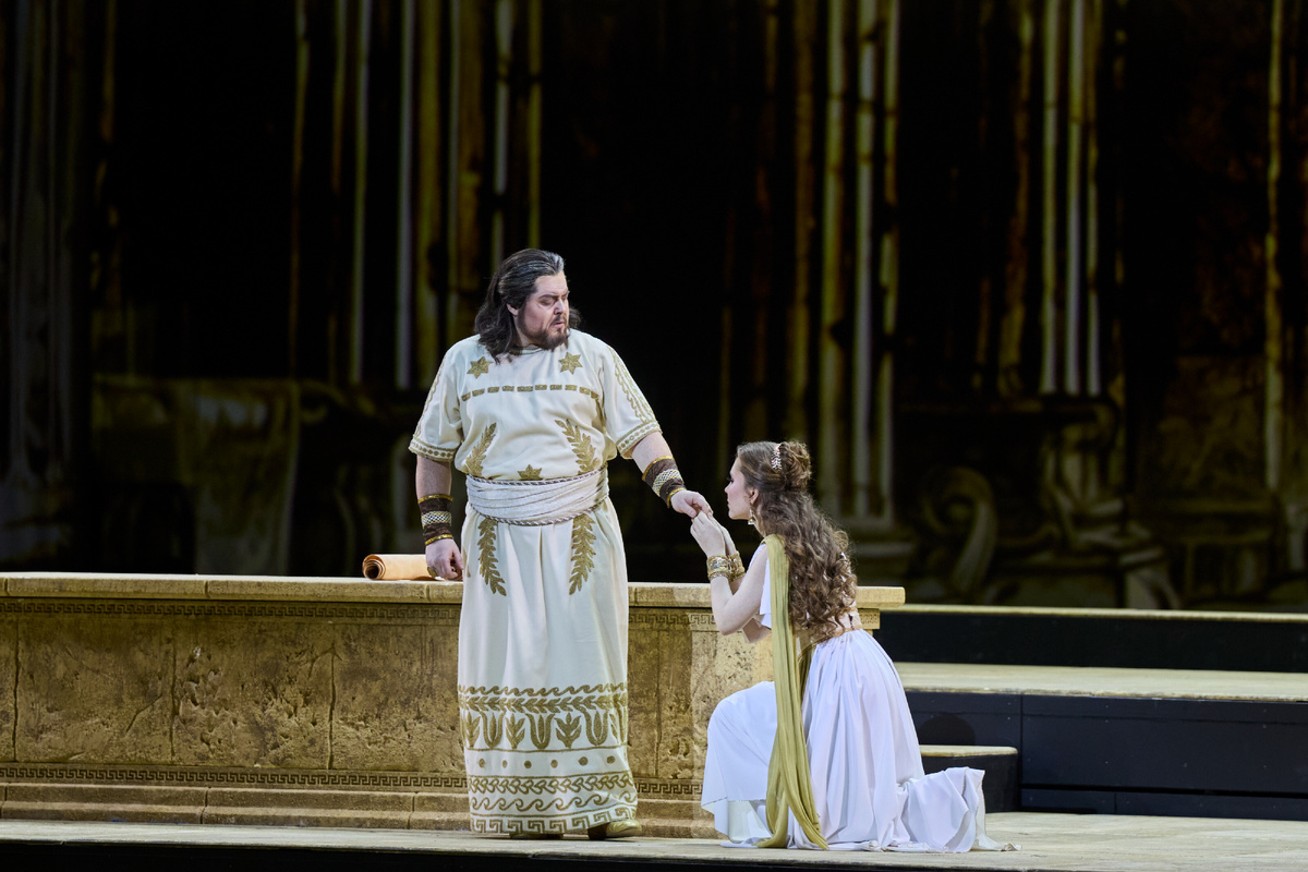 Персонажи на сцене облечены в классический древнегреческий костюм – что, в общем-то, условность: эпоха Троянской войны бесконечно далека от классики времен Перикла. Сцена устроена террасами-уступами, словно имитируя древнегреческий амфитеатр, пространство для лицедейства. Она, в общем-то, пуста – незначительный реквизит и постоянно меняющиеся уровни террас в соответствии с придуманными режиссером мизансценами – вот, собственно, весь ее нехитрый визуал. Движения героев неспешны, просты, скупы, хотя «концертом в костюмах» тут не пахнет – в этой простоте и лапидарности заключен смысл: концентрированное проживание артистами трактуемых образов гармонично классицистской чистоте и древнегреческой драмы, и моцартовской музыки.