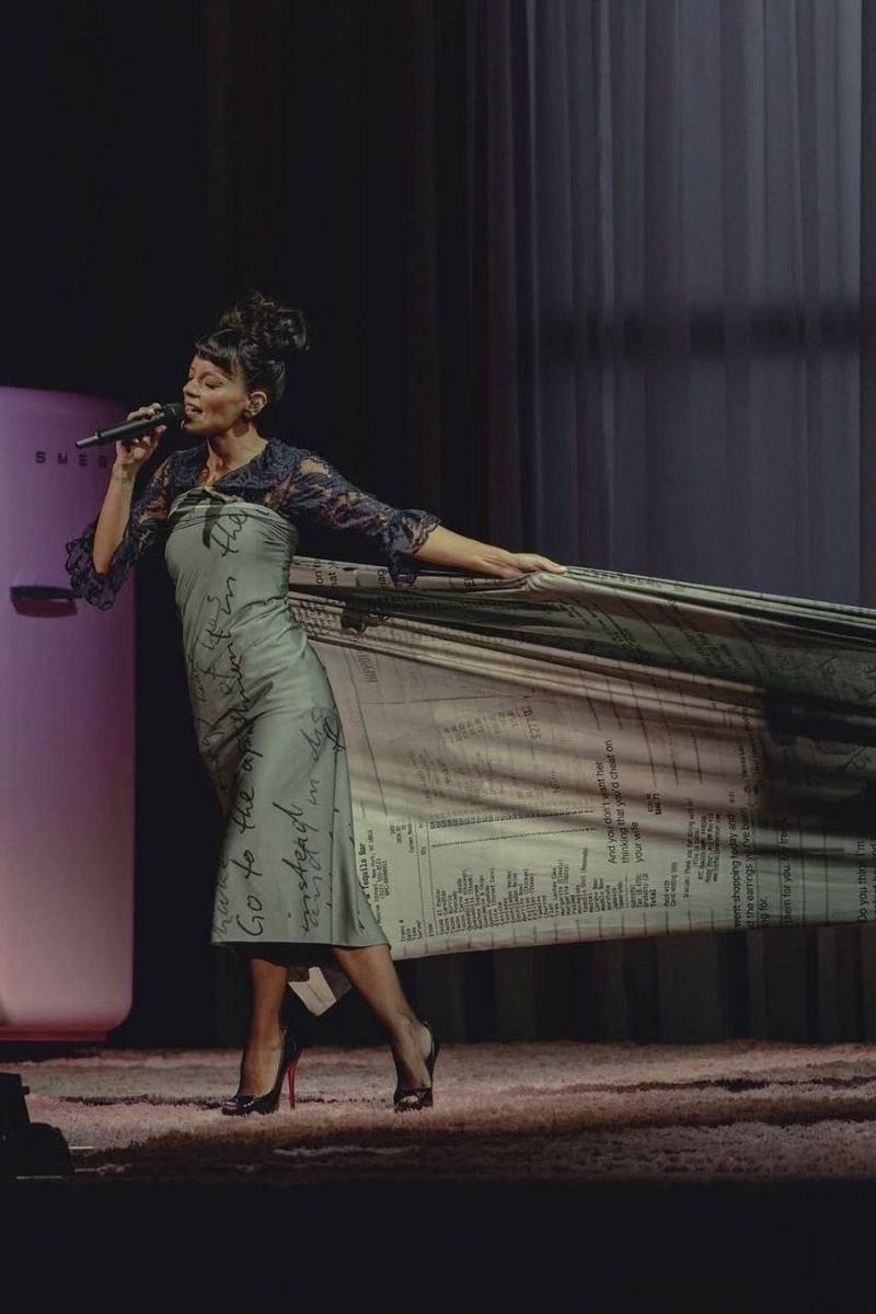 На концерте в Глазго Лили Аллен вышла на сцену в платье с огромным шлейфом, на котором отпечатаны чеки из магазинов и ресторанов, куда её
