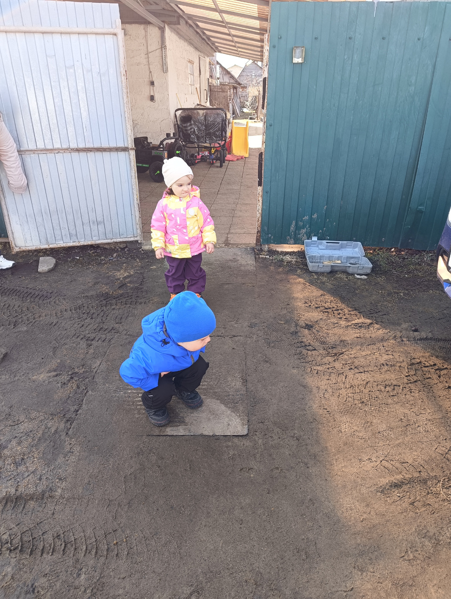 Двойняшки все намереваются в песочницу залезть. Там с зимы игрушки некоторые остались. Но песочница еще плавает. Вместо песка там кисель. Отойдут, а потом опять возвращаются. Всё, говорят, высохло уже.