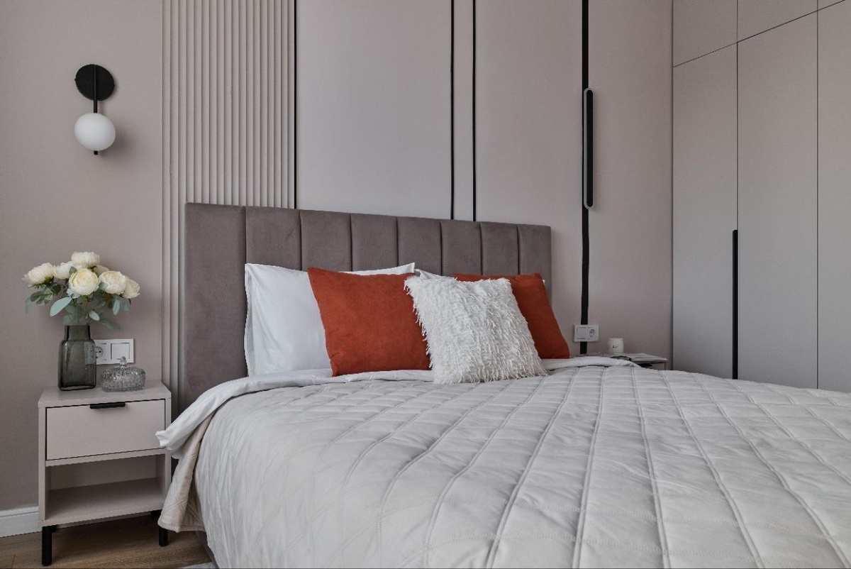 .... превращаются в готовый ремонт. 🌟Стиль интерьера: современный 🌟Цветовая гамма: с оранжевыми акцентами и черными деталями. 🌟Кухня: серая с гладкими фасадами в современном стиле. На фартуке красивый керамогранит под мрамор. В зоне обеденного стола 3д панели. 🌟Спальня: мы добавили интересный приём, где на фоне черной полосы — черный вытянутый светильник, который является продолжением линии на стене. @sakmarova_design → Дизайн и ремонт без нервов📝 #фото #инвестремонт