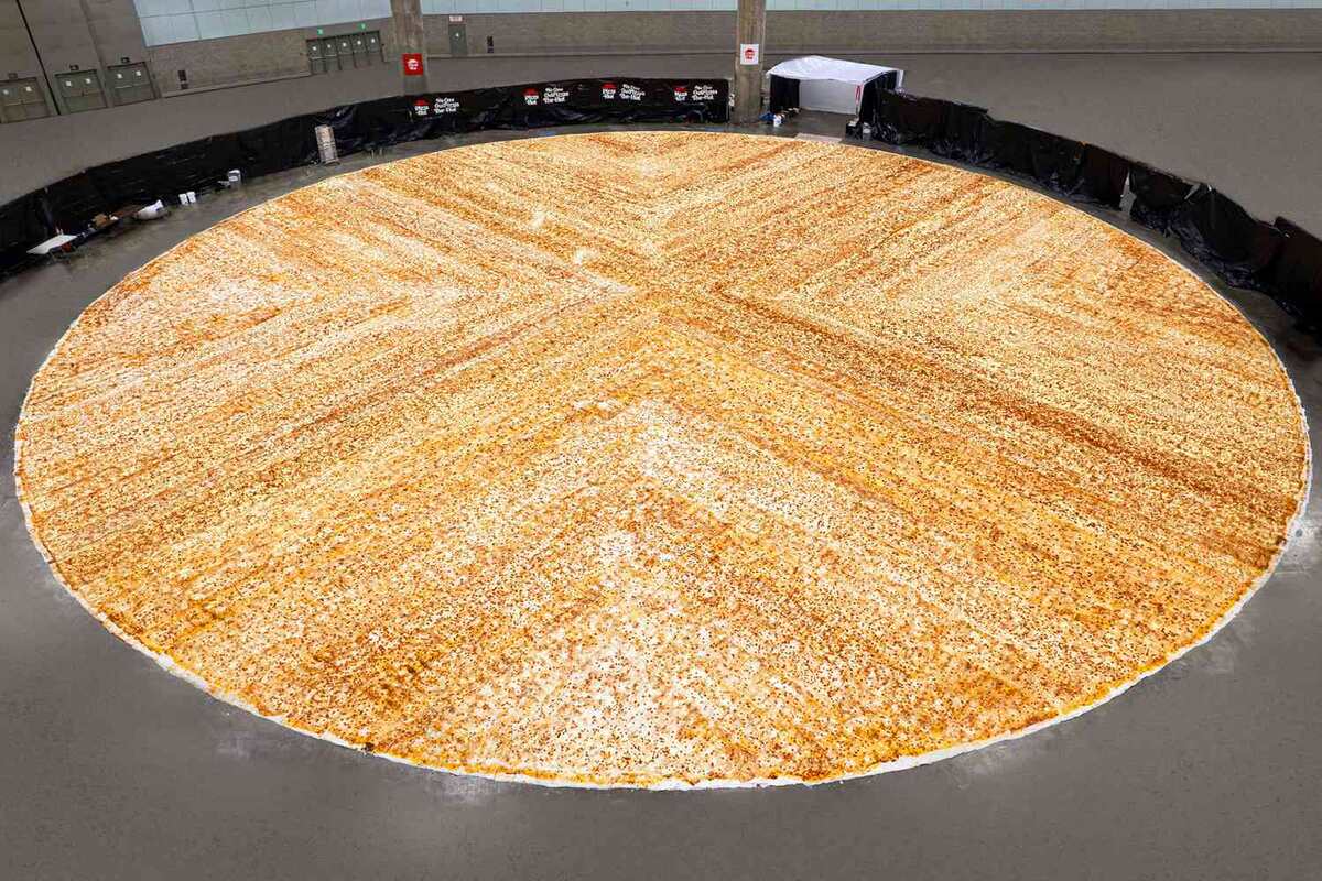 — десятки обычных пицц вместе Это не теория. Её реально приготовили. Та же пицца. Те же ингредиенты. Но масштаб меняет восприятие полностью.