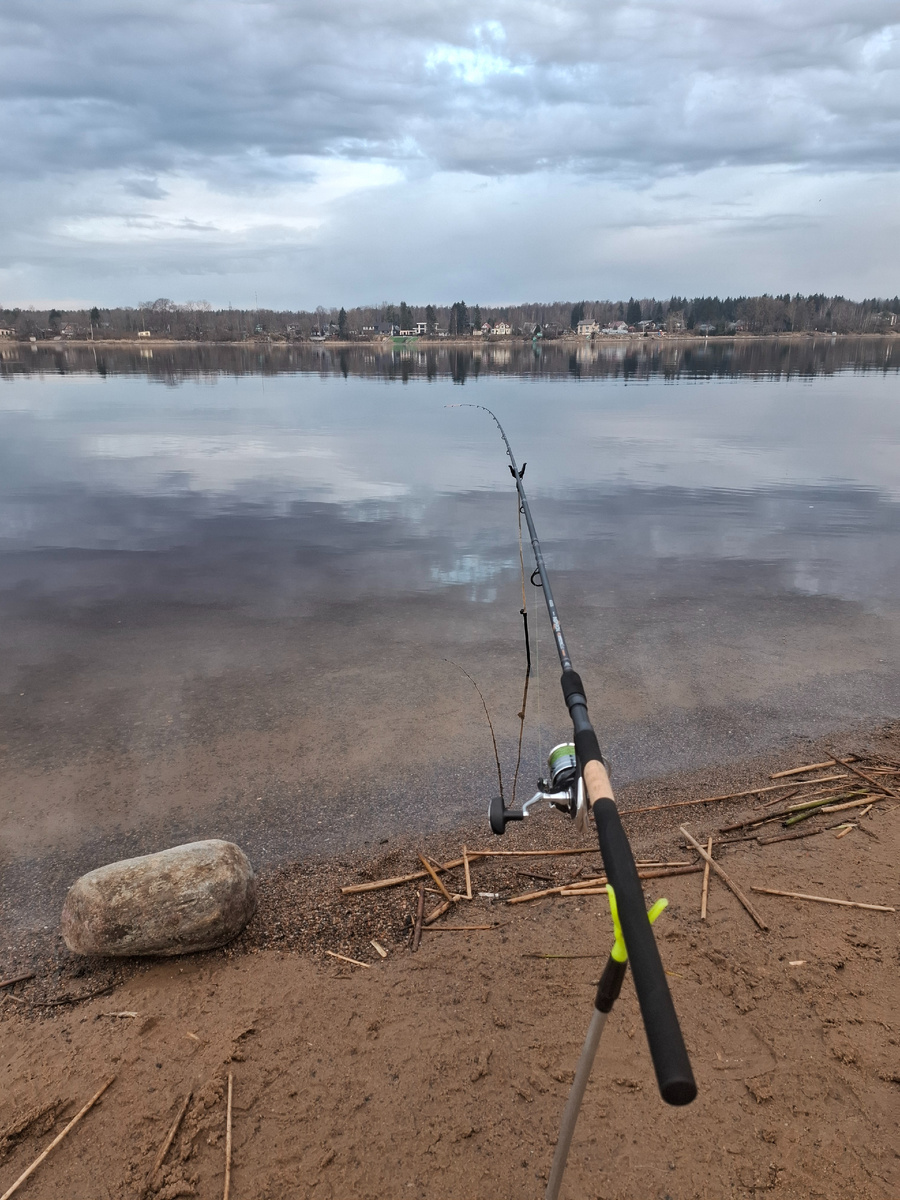 Через несколько минут снасть была готова к первому забросу. Удилище взял с собой длиной 3.90м., и тестом 60-120 грамм. Для начала решил начать рыбалку с довольно лёгкой кормушки на 60 грамм. Заброс снасти на 20 метров от берега, самое начало свала с глубиной около 4 метров. Дно песчаное с мелкой галькой. Место это мне уже знакомо, пять лет назад я уже здесь рыбачил по весне.