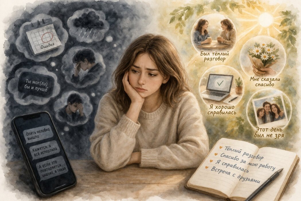 Бывает, что в жизни есть что-то хорошее: теплый разговор, удачно сделанная работа, чье-то внимание, поддержка. Но это как будто не задерживается: промелькнуло и исчезло. А вот что-то неприятное, даже не очень значительное, может крутиться в голове часами или возвращаться снова и снова. Один неловкий момент перекрывает весь день. Одно сомнение — десятки подтверждений. И в какой-то момент возникает ощущение, что «в целом все плохо», хотя если остановиться и посмотреть шире, картина могла бы быть совсем другой. Здесь дело не в том, что человек «специально» концентрируется на плохом или не умеет радоваться. Это скорее особенность того, как работает внимание и мышление, особенно когда внутри уже есть напряжение или тревога. Психика устроена так, что она быстрее замечает потенциальную угрозу, чем что-то нейтральное или хорошее. Это базовый механизм выживания: лучше переоценить опасность, чем пропустить ее. Поэтому неприятные события автоматически получают больше «веса» — на них легче зафикси