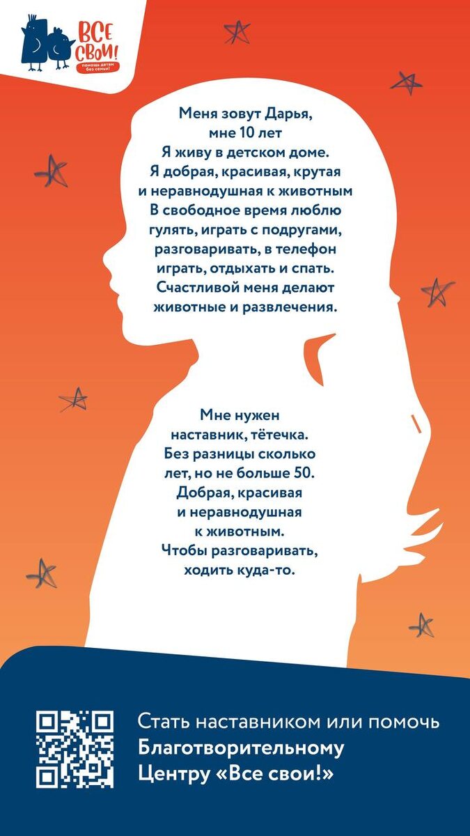 Каждому нужен свой человек рядом! Прямо сейчас в детском доме Лесосибирска есть подростки, которые очень ждут взрослого — не «волонтёра на час», а того, с кем можно поговорить, погулять, поделиться новостями и просто побыть собой. Наставник — это не про подарки и мастер-классы. Это про дружбу и внимание. Наставник приходит к одному конкретному ребёнку: они общаются, проводят время вместе, выходят за пределы учреждения — в обычную жизнь, где есть прогулки, разговоры, планы и поддержка. Это старший друг, который остаётся рядом. У наставничества две важные задачи: — дать ребёнку опыт надёжных и доверительных отношений, без которого невозможно строить будущее; — помочь освоить простые, но жизненно важные навыки — от общения до самостоятельной жизни. Чтобы стать наставником, не нужно быть идеальным. Важно быть взрослым, которому не всё равно. Центр «Все свои!» сопровождает наставников на всех этапах: проводит обучение, поддерживает психологически и помогает в сложных ситуациях. Если в