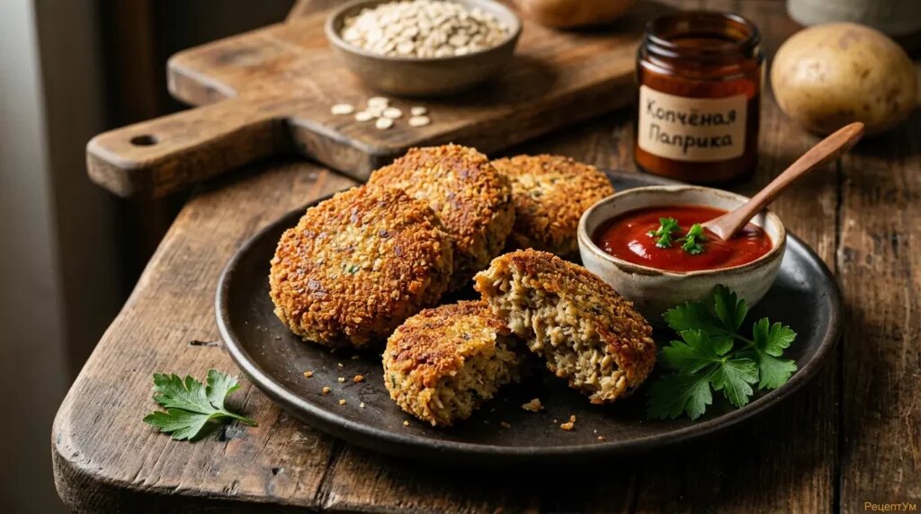 Только Геркулес: Хлопья быстрого приготовления (3 минуты) дают слишком мягкую массу – котлеты разваливаются. Берите цельный или крупный Геркулес с варкой 10–15 минут.Отжимайте картофель тщательно: Лишняя влага – главная причина, почему котлеты расползаются на сковороде. Чем суше масса, тем плотнее получится котлета.Копчёная паприка обязательна: Обычная сладкая не даёт того эффекта. Именно копчёная создаёт аромат, который вводит в заблуждение даже любителей мяса. Найдёте в любом супермаркете рядом со специями.Хорошо разогрейте масло: Если положить котлеты в холодную сковороду – они пропитаются маслом и станут жирными. Проверьте: бросьте щепотку панировочных сухарей – если зашипело, можно выкладывать.
