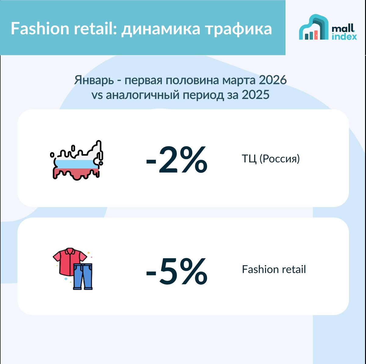 Январь - первая половина марта 2026 vs аналогичный период за 2025: −2% ТЦ (Россия) −5% fashion retail 📊 Сегмент fashion демонстрирует более выраженное снижение трафика относительно общей динамики торговых центров. «Магазины уезжают из небольших районных торговых центров, где пересматривается сам формат визита посетителей. Площади идут под фудкорты, рестораны и просторные фитнес-клубы. Офлайн-досуг сейчас — это получение впечатлений, а не покупка вещей», — Михаил Васильев, Focus Technologies.