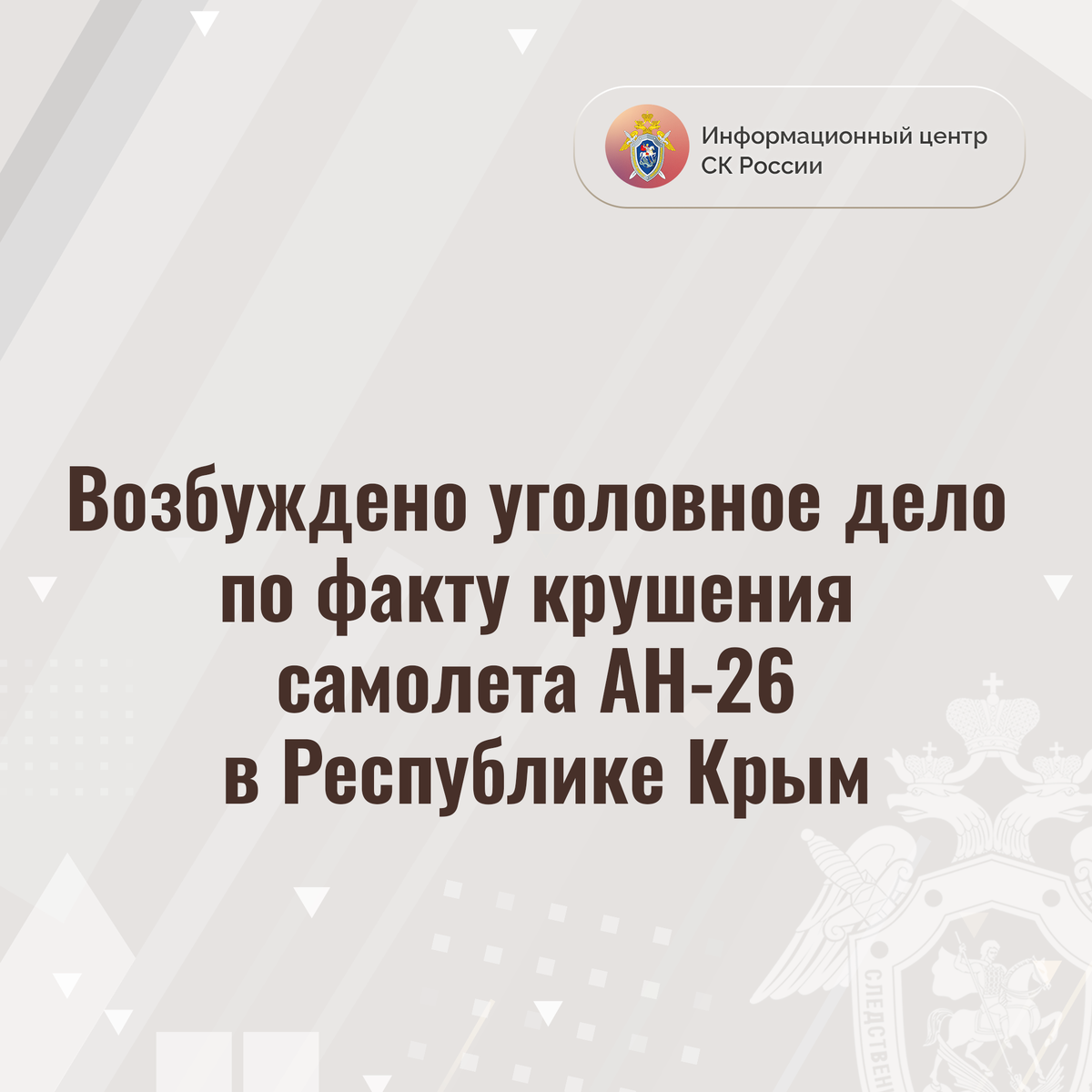 Возбуждено уголовное дело по факту крушения самолета АН-26 в Республике Крым Военными следственными органами Следственного комитета Российской Федерации по факту крушения самолета АН-26 возбуждено уголовное дело по признакам преступления, предусмотренного ст. 351 УК РФ (нарушение правил полетов или подготовки к ним). 31 марта 2026 года при выполнении полета самолет АН-26 потерпел крушение в районе села Куйбышево Бахчисарайского района Республики Крым. На борту находилось 7 членов экипажа и 22 пассажира. В настоящее время военные следователи, криминалисты, сотрудники управления криминалистики ГСУ СК России по Республике Крым и г. Севастополю, МЧС и МВД России проводят поисковые мероприятия в горном лесном массиве Бахчисарайского района Республики Крым. Устанавливаются все обстоятельства произошедшего.