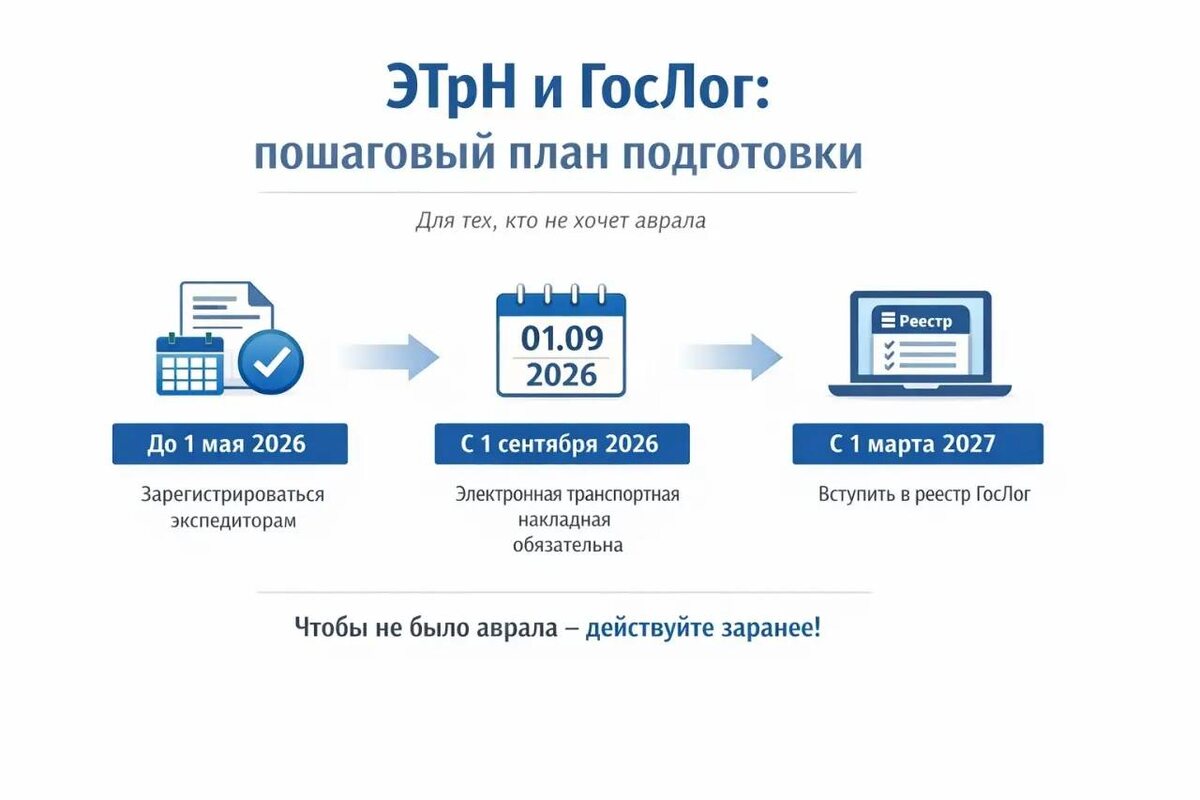 С 1 сентября 2026 года транспортная накладная станет обязательной только в электронном виде. С 1 марта 2027 года перевозчики должны быть в реестре ГосЛог. Экспедиторы обязаны зарегистрироваться уже до 1 мая 2026.