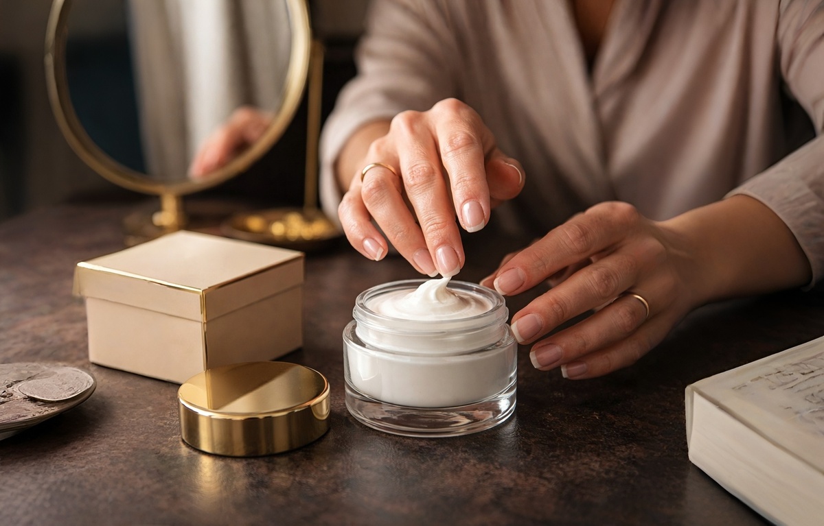 Зеркало в прихожей. Она нанесла крем на лицо — лоб, щёки, подбородок — медленно, обеими руками, глядя себе в глаза.