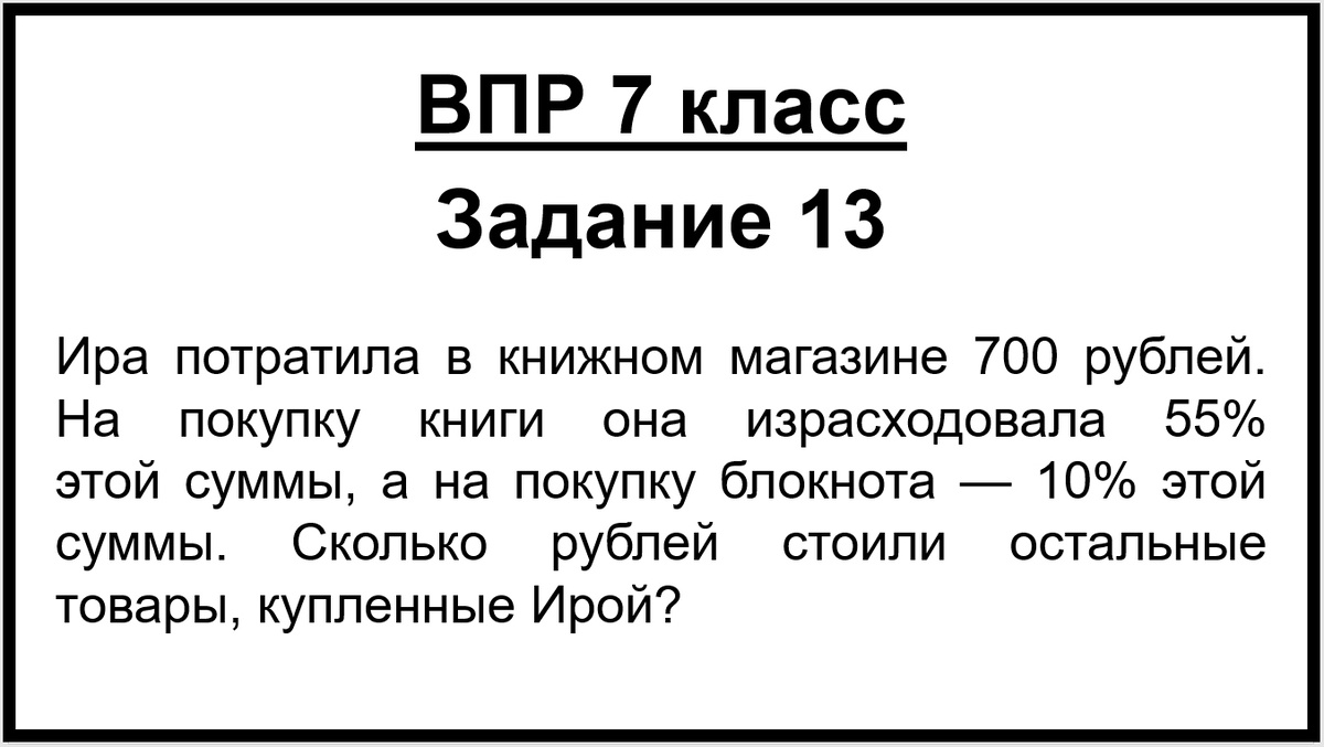Задание 13 ВПР по математике для 7 класса — это задача на проценты. Многие ученики теряют баллы именно здесь, потому что путаются в переводах процентов в дроби или не понимают, какой способ выбрать. А родители часто не могут объяснить, потому что сами забыли школьную программу. В этой статье я разбираю три способа решения одной задачи. Каждый способ объяснён максимально подробно, с пояснением «почему мы делаем то или иное действие». Вы сможете выбрать тот, который понятнее именно вашему ребёнку (или вам самим). Ира потратила в книжном магазине 700 рублей. На покупку книги она израсходовала 55% этой суммы, а на покупку блокнота — 10% этой суммы. Сколько рублей стоили остальные товары, купленные Ирой? Что делаем: