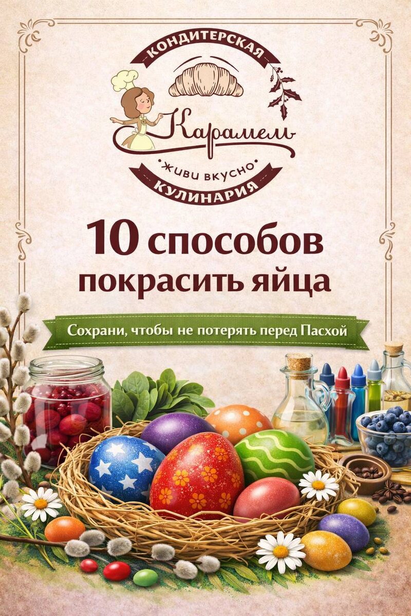 🥚✨ Собрали для вас 10 простых способов, которые легко повторить дома Без сложных ингредиентов, только то, что уже есть на кухне 👇 От классической луковой шелухи до необычных вариантов с ягодами и шпинатом 🌿 💡 Маленький секрет: чтобы цвет получился ярче, добавляйте уксус Сохраняйте карусель, чтобы не потерять перед Пасхой 📌 И напишите в комментариях, какой способ попробуете первым? #пасхальныеяйцат #какпокраситьяйца #натуральныекрасители #лайфхакидлякухни #кулинария #домашниерецепты #идеинапасху #пасхальныйдекор #яйцанапасху #рецептыпросто #кондитерская #карамель #кондитерскаякарамель