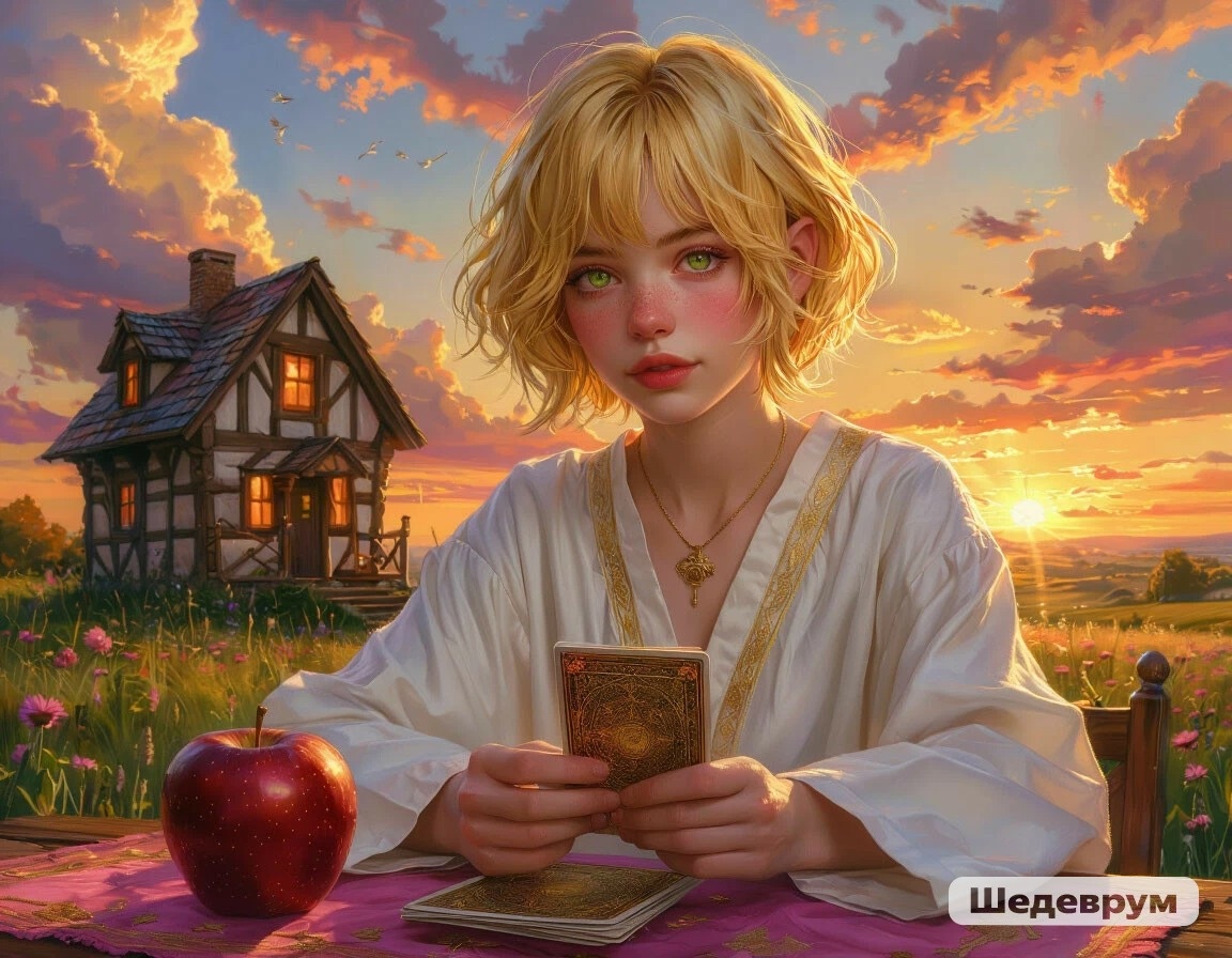 Я же, опишу своё стандартное видение-трактовку. Если почувствуете, что где-то внутри мой текст "откликается" , то так тому и быть. Если ощутите отторжение информации, то прислушивайтесь только к себе🙌. На сегодняшней метафорической карте большое яблоко раскрывается как сцена, а внутри виднеется дорога к маленькому городу. Яблоко - соблазн, выбор и плод новых возможностей, дорога - путь и решение, город - цель и общество, занавес - раскрытие тайны и выход на новый этап. День предвещает момент неожиданности: за простым предложением может скрываться важный шанс. Утром - начни день с полезного завтрака, выбери красный, зелёный или бежевый акцент в образе. Днём - принимай решения дважды подумав, не занимайся покупками, обещаний лучше не