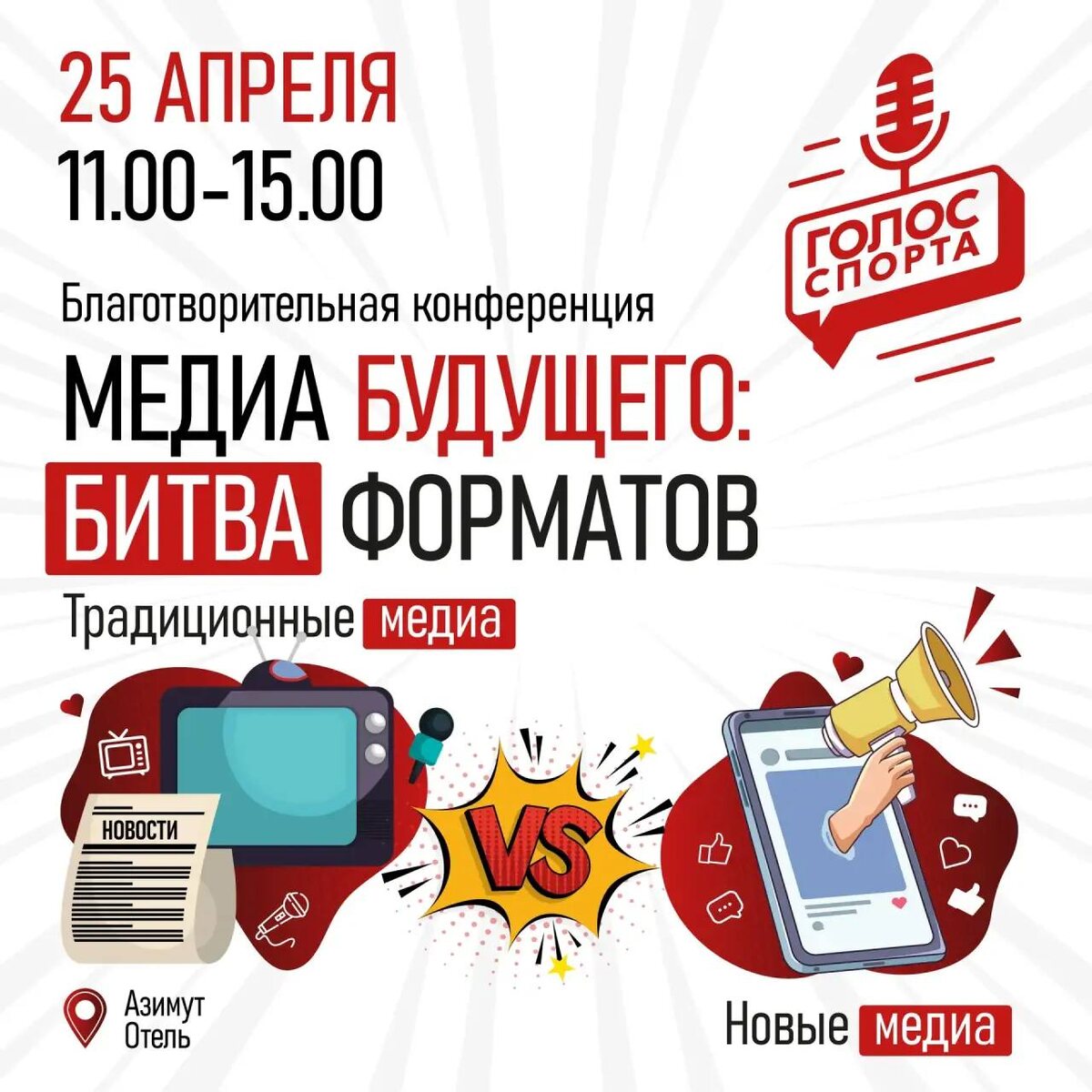 «Медиа будущего. Битва форматов» 25 апреля в Воронеже пройдет благотворительная конференция «Медиа будущего. Битва форматов» — событие для всех, кто развивает себя, личный бренд или бизнес через медиа. Что вас ждет в программе Главный формат события — кейс-баттл «Традиционные медиа vs новые медиа». На одной площадке встретятся ведущие блогеры Центрального Черноземья, представители региональных и федеральных СМИ, а также эксперты по RuTube, Дзен и VK из Москвы. Участники покажут, что сегодня действительно работает в медиа: какие тренды, какие технологии и как выстраивать доверительные отношения с аудиторией. Дата: 25 апреля Место: «Азимут Отель», 11 этаж, конференц-зал Время: 11:00–15:00 Стоимость участия: 3000 рублей Ссылка на регистрацию откроется 5 апреля. Важно: все средства, собранные от участия, будут направлены на создание социально значимого видеоконтента о воронежских спортсменах. Отчет о расходовании средств будет опубликован на странице Центра развития спортивного пред