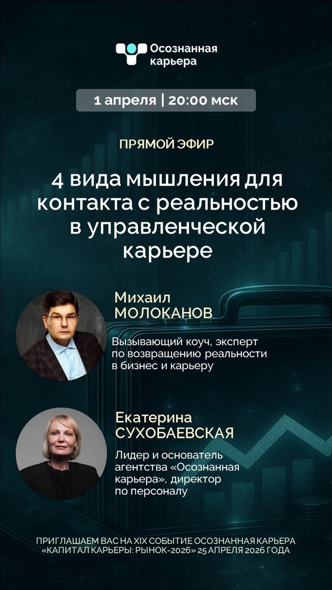 Эксперт: Михаил Молоканов - вызывающий коуч, эксперт по возвращению реальности в бизнес и карьеру. Коуч глав. Международный эксперт и ведущий стратегических сессий по лидерству, партнерству в бизнесе и сыгранности команд топ-менеджеров. В прямом эфире мы разберем четыре уровня «прошивки» руководителя, без которых переход на executive-позиции невозможен🚀 1️⃣ Управленческое мышление: Желание vs Сопротивление. 2️⃣ Аффективное мышление: 4 аксиомы человеческого «интерфейса». 3️⃣ Системное мышление: Руководитель как «узел» сети. 4️⃣ Критическое мышление: Ревизия ММ. 🎁 Для участников прямого эфира розыгрыш: место на индивидуальную коучинговую сессию с Михаилом Молокановым на Событии XIX Осознанная карьера "Капитал карьеры: рынок-2026" 🛍 Всем участникам прямого эфира дарим 20% на покупку билета на Событие XIX Осознанная карьера 📅 Дата: 1 апреля ⏰ Время: 20:00 📍 Где: https://3kbk1lw3.ktalk.ru/h8ev0a6h0wxh Этот эфир для тех, кто готов признать: карьера - это не только про «делать», эт