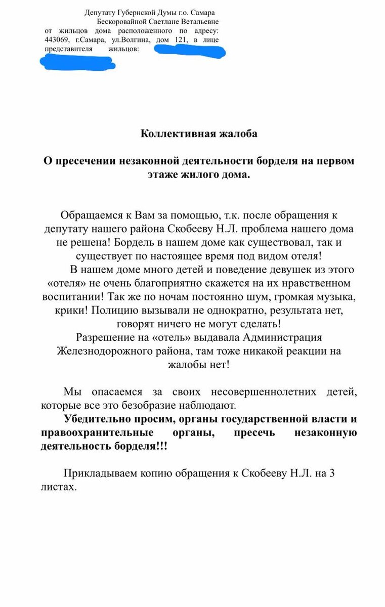 Там, где по документам значится «нежилое помещение с отдельным входом», по факту совсем другая реальность, с ночным трафиком, криками, алкоголем и тем самым «гостиничным сервисом 18+» История с домом на улице Волгина, 121 как раз из этой серии. Как бы всё прилично, «отель» с отдельным входом, вроде бы и бизнес. Однако на деле круглосуточный поток клиентов, шум, мусор, выброшенные из окон вещи и регулярные вызовы полиции, которые одинаково заканчиваются ничем. Люди фиксируют, пишут, жалуются, собирают подписи, но в ответ получают лишь отписки «разберёмся», «проверим», «в рамках компетенции»…и тишина. Точнее, не тишина, а музыка по ночам и крики, то пьяные, то сладострастные Жильцы уже прошли стандартный маршрут обращений. Сначала, к председателю Совета депутатов Железнодорожного внутригородского района Николаю Скобееву. Затем к депутату губернской думы Светлане Бескоровайной. Но, судя по содержанию жалобы, смена адресата пока ничего не изменила, проблема как существовала, так и продол