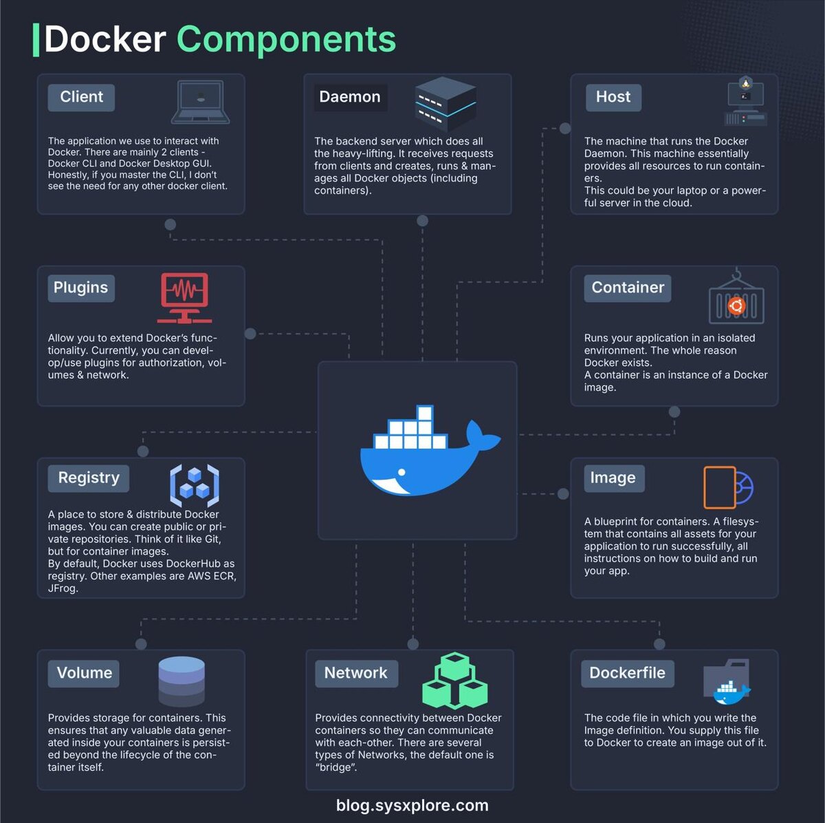 : → Client - основной интерфейс (CLI или GUI), через который ты управляешь Docker → Daemon - фоновый сервис, который обрабатывает команды клиента: собирает, запускает и управляет контейнерами → Host - физическая или виртуальная машина, где работает Docker и запускаются контейнеры → Image - неизменяемый шаблон (образ) с файловой системой и всем необходимым для запуска приложения → Dockerfile - файл с инструкциями, по которым собирается Docker-образ → Container - запущенный из образа изолированный экземпляр приложения → Registry - хранилище Docker-образов (например, Docker Hub или AWS ECR) → Volume - постоянное хранилище данных, которое сохраняется вне контейнера → Network - обеспечивает безопасную связь и взаимодействие между контейнерами