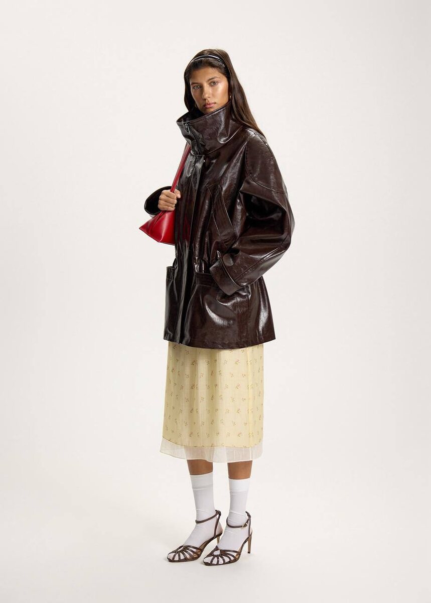 Куртка из новой коллекции, о которой мы ещё не рассказывали подробно. Глянцевая экокожа в шоколадном оттенке. Удлинённый силуэт, воротник-стойка, заниженная кулиска на талии. 🤎 Заниженная кулиска — актуальная деталь сезона, которая позволяет менять силуэт. Носите свободно для расслабленного объёмного кроя или затяните для более структурированного образа. Четыре функциональных кармана. Высокий воротник защищает от ветра. Куртка для переходного сезона — то, что нужно сейчас. Носите с юбками, брюками, платьями. Функциональная верхняя одежда с актуальным силуэтом.