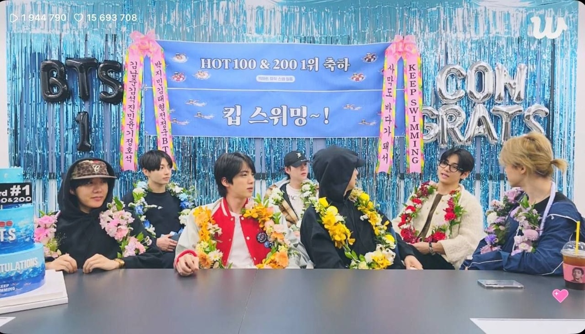 Всем привет, с вами Магия Азии и я, Ще ✌ Сегодня бантосики провели краткий совместный эфир, чтобы лично поблагодарить фанатов за победу в чартах журнала Billboard (подробнее об этом ЗДЕСЬ) и я тут, чтобы коротко рассказать о том, что было в эфире самым нетерпеливым. Остальные могут дождаться видео с русскими субтитрами, которое, возможно, последует. Итак, ребятки нашли время в своем плотном графике и высунули в эфир свои симпатичные мордашки. Стафф, как всегда постарался, "украсить" студию в своем фирменном нелепом стиле. Парням вручили шикарный синий торт и цветочные венки. Такие шикарные венки парни, конечно, не могли оставить без внимания, поэтому немедленно и очень живо их обсудили, не преминув отметить, что они теперь как будто на Гавайях (эх, вот бы на Гавайи сейчас!). "Тэхен: Ааа, они подготовили красные цветы, зная, как я люблю красный. Чонгук: Мне дали синий, чтобы успокоить мой огонь, согласно моей судьбе. Чимин: Мне дали фиолетовый, зная, как я люблю АРМИ Джин: Нам тепер
