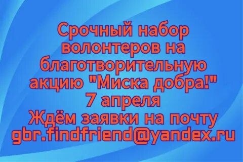 ❗️❗️❗️ Москва. Московская область. Организатор выставок «Найди друга» Центр защиты животных АНО «ГБР.Зоозащита» объявляет набор на благотворительную акцию «Миска добра» - сбор гуманитарной помощи животным без хозяина. В рамках акции возможно пристройство хвостатых участников! Акция будет проходить с 23 марта по 12 апреля, каждый день в ТЦ «Глобал Молл», Москва, м. Автозаводская, ул. Ленинская Слобода, д. 26, стр.2 Для участия возможны любые интервалы по времени с 12 до 20 часов. Но не менее 5 часов. К акции допускаются кошки, котята, щенки, собаки до среднего размера. Возможно участие котят и щенков не привитых по возрасту, но клинически здоровых! Нужно привезти для кошек свои клетки, для щенков можно клетки или манеж. Стол предоставит ТЦ. Весь собранный за день корм забирает собиравший его куратор. 1 день - 1 куратор и его подопечные. Справки из госветстанции не нужны. Заявки принимаются на почту gbr.findfriend@ya.ru. 1 дата - 1 животное - 1 письмо В теме письма - Миска добра, к