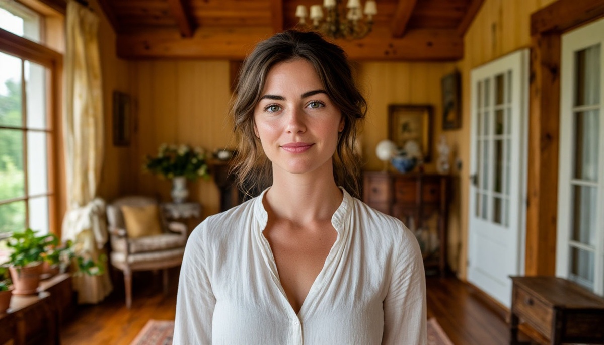 Новый кадр: женщина в простом свитере, с волосами, собранными в хвост.