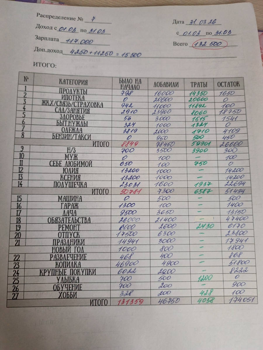 В марте у меня как обычно было 3 распределения, которые подробно можно посмотреть на моем канале. Распределяла зарплату мужа (117.000 руб) и два дополнительных дохода (4250 руб и 11250 руб), сюда вошли продажи на авито, процент по накоплениям, кэшбэк и оплата за аренду студии.