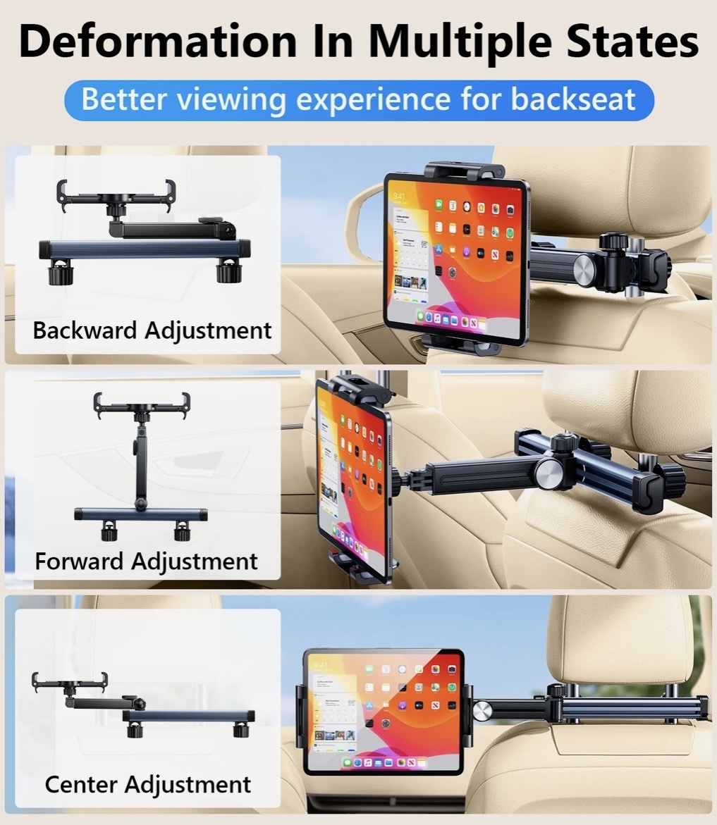 Автомобильный держатель для планшета на подголовник — это крепление, которое фиксируется на штангах подголовника переднего сиденья и надёжно удерживает планшет на уровне глаз пассажира сзади.