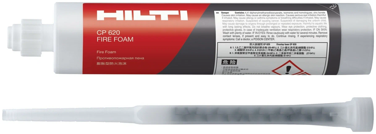 Hilti CP 620 — это двухкомпонентная полиуретановая пена, предназначенная для герметизации противопожарных проходок. Продукт выпускается в коаксиальном картридже объемом 300 мл (красный цвет) и требует использования специального дозатора DSC .